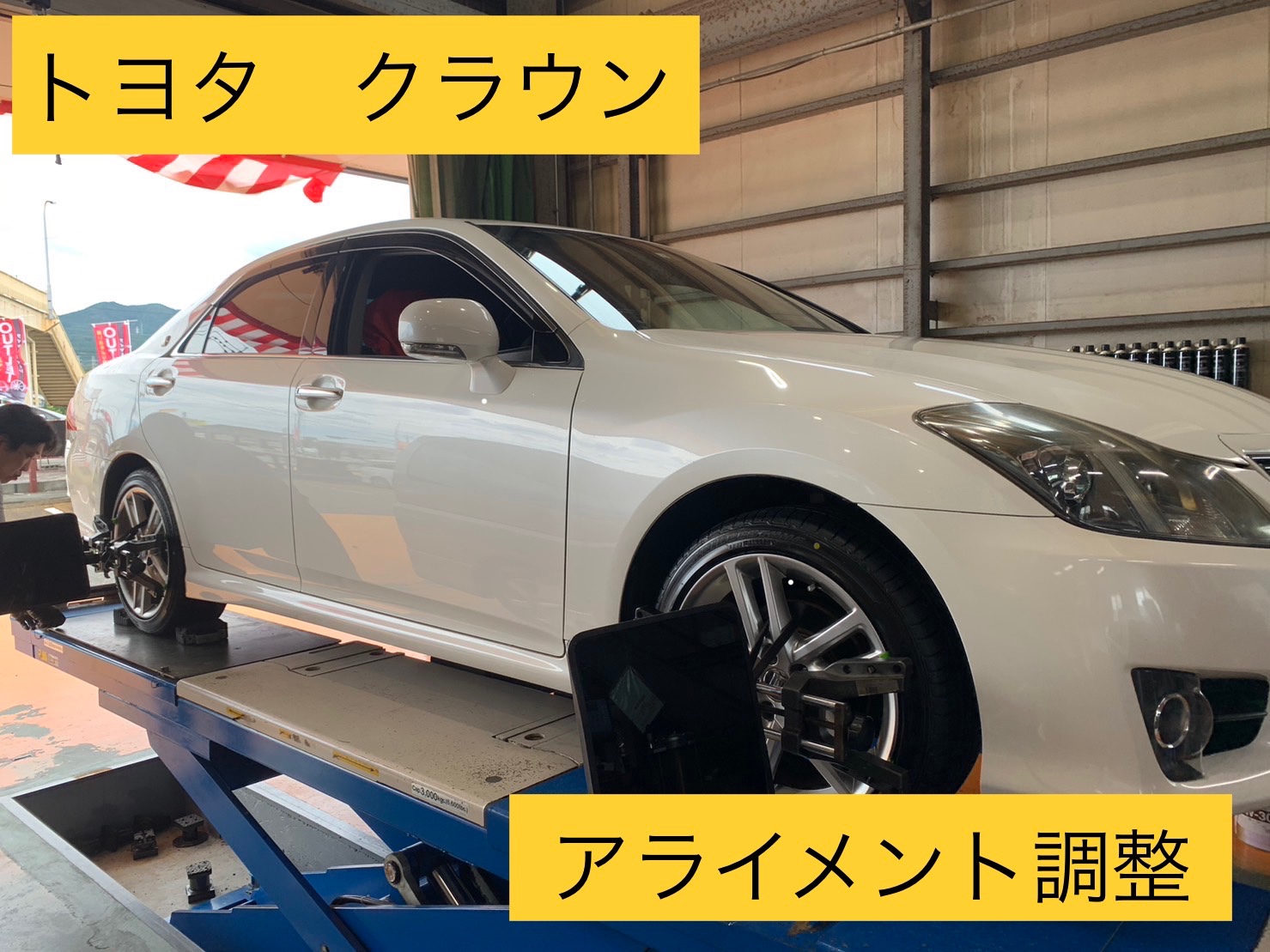 【いつもご利用ありがとうございます】トヨタ クラウン アライメント調整!※タイヤの内側が片減りしていて、ハンドルが少し右に傾いているので、ハンドルを真っ直ぐに調整をし、偏摩耗の抑制の為!