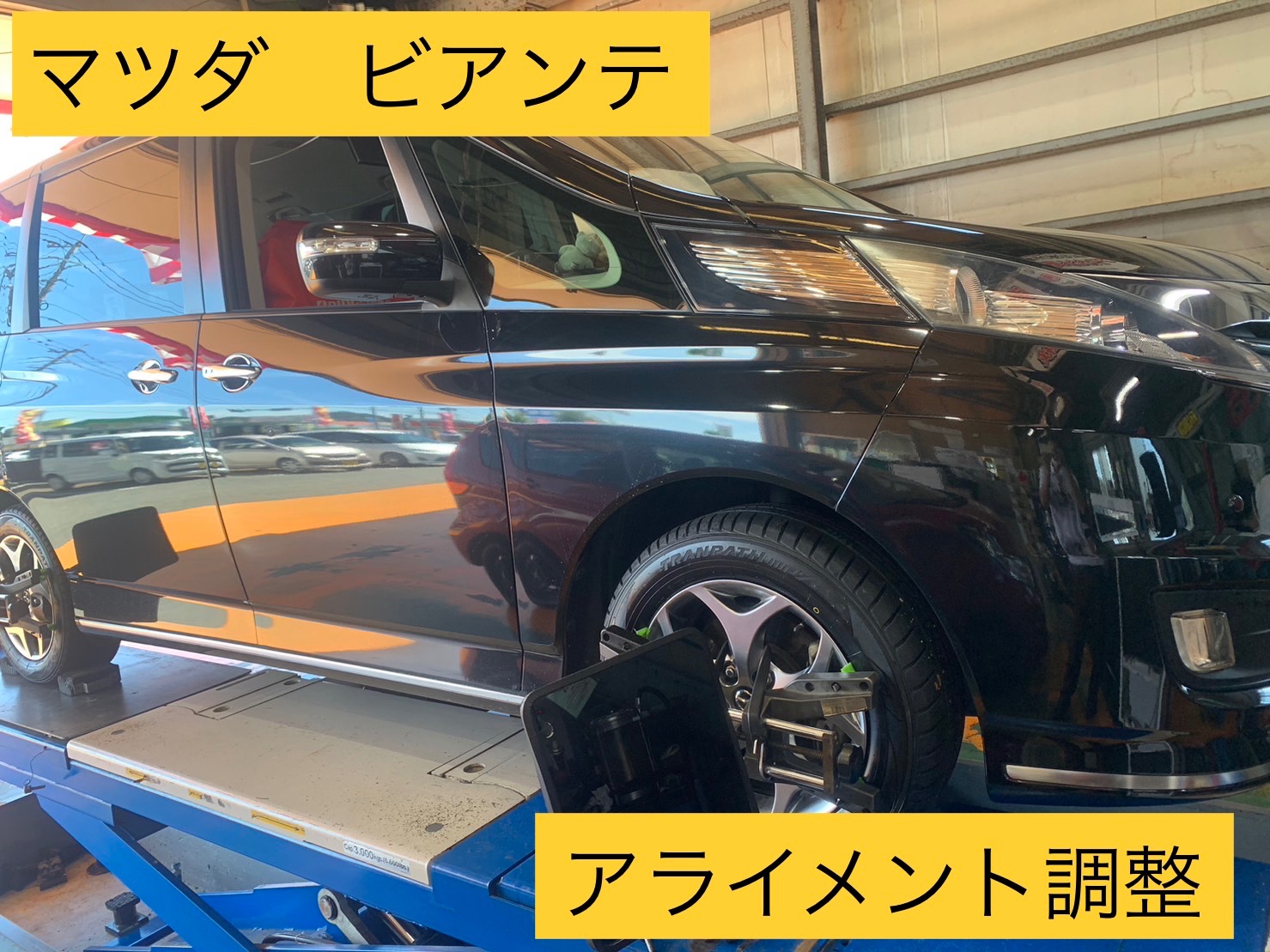 【いつもご利用ありがとうございます】マツダ ビアンテ アライメント調整!※リアタイヤの内側の減りが異常に早い。今後タイヤの長持ちに繋がってほしい為!