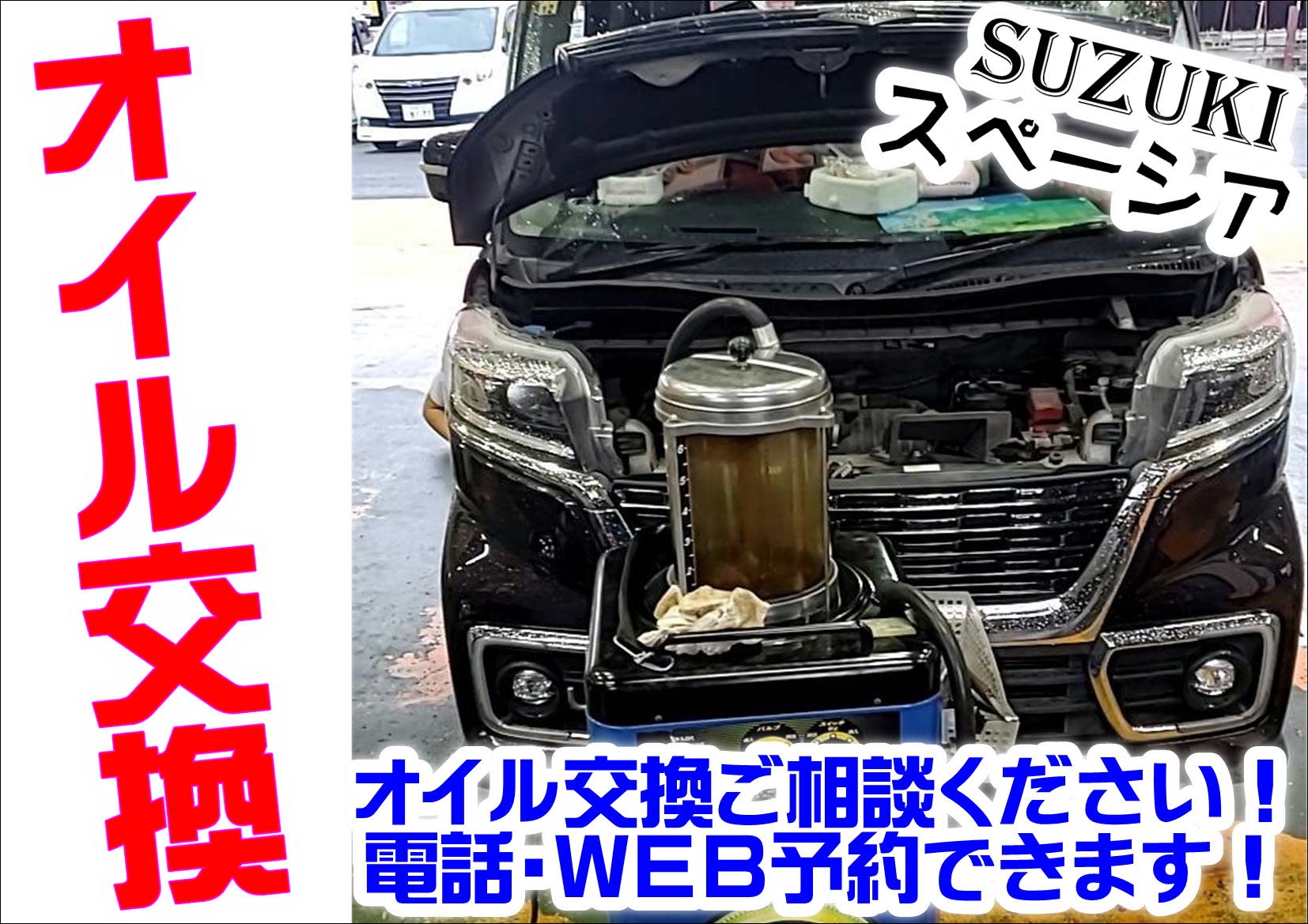 Google 口コミを見て!【WEBを見て初めてのご来店】スズキ スペーシア メンテナンスメニュー 《エンジンオイル交換》※お出かけ後の、お車の点検はされてますか?只今、無料点検実施中です!