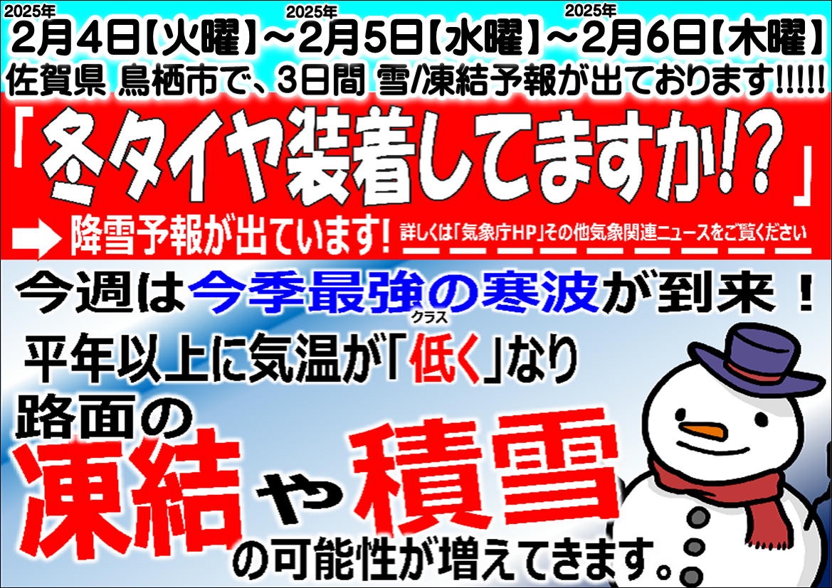 重大発表!! 2月4日【火曜】 〜2月6日【木曜】の3日間に、雪予報が佐賀地区(鳥栖市)に発表されております。皆様、冬支度(スタッドレスタイヤ・チェーン)はされてますでしょうか?