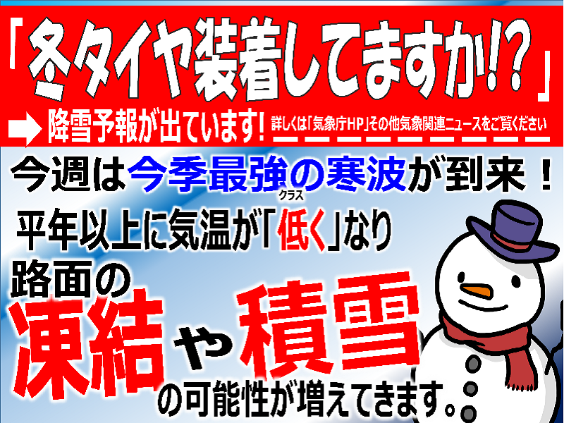 重大発表!! 本日〜2月7日【金曜】にかけて、雪予報が佐賀地区(鳥栖市)に発表されております。皆様、冬支度(スタッドレスタイヤ・チェーン)はされてますでしょうか?