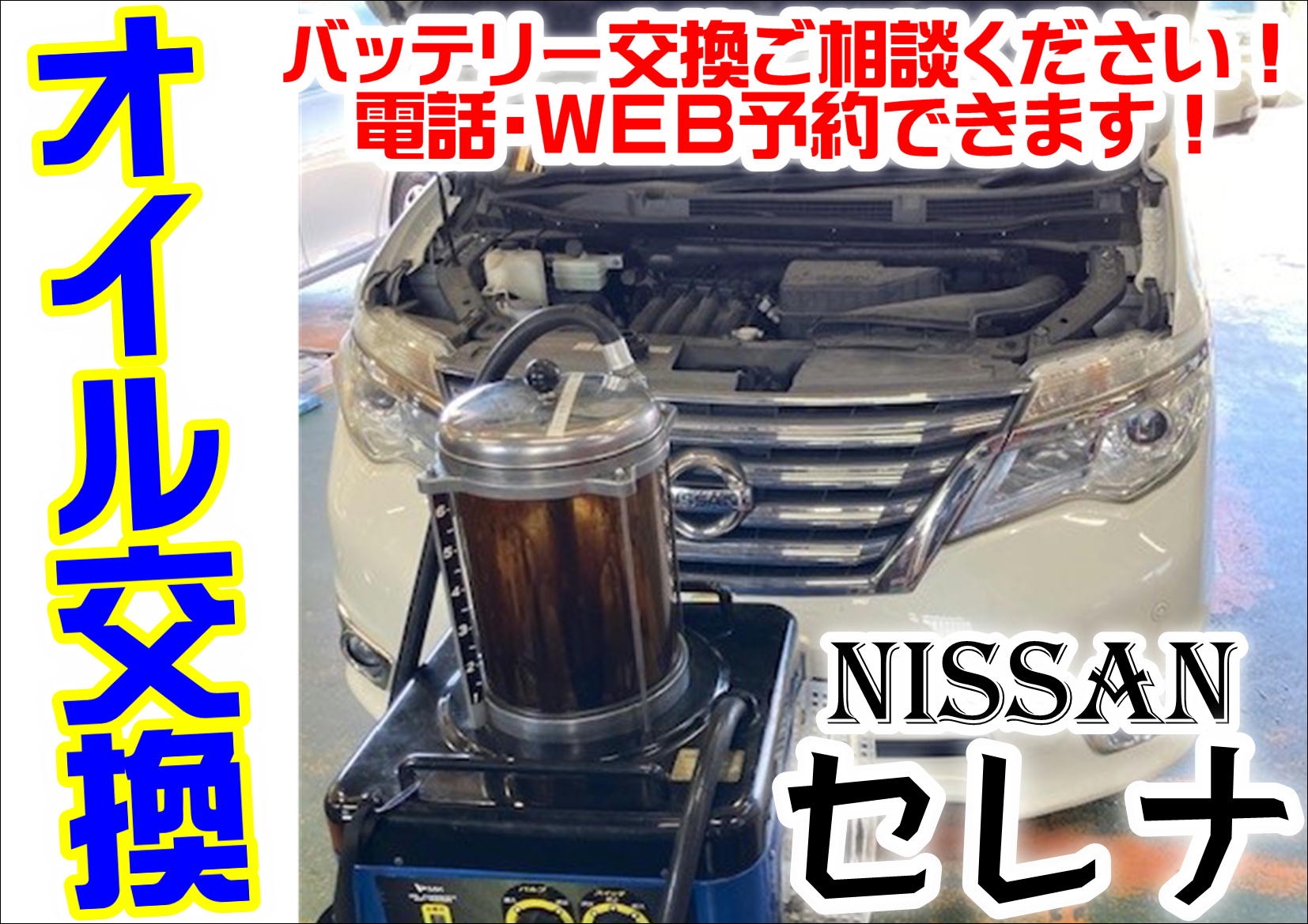 Google 口コミを見て!【WEBを見て初めてのご来店】日産 セレナ《エンジンオイル交換》※お出かけ後の、お車の点検はされてますか?只今、無料点検実施中です!