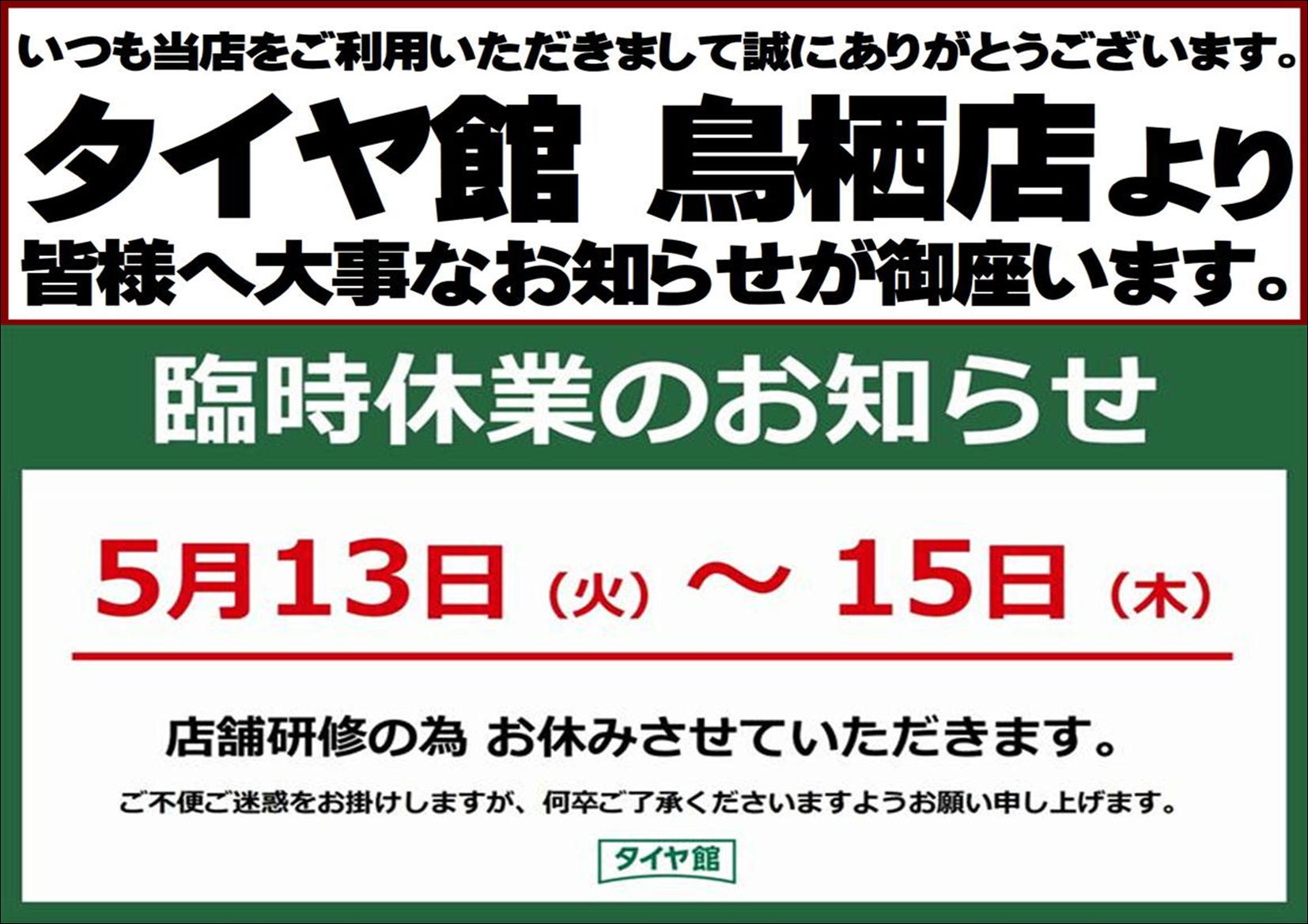 5月の店舗営業に関して、下記日程を社員研修の為臨時休業とさせていただきます。