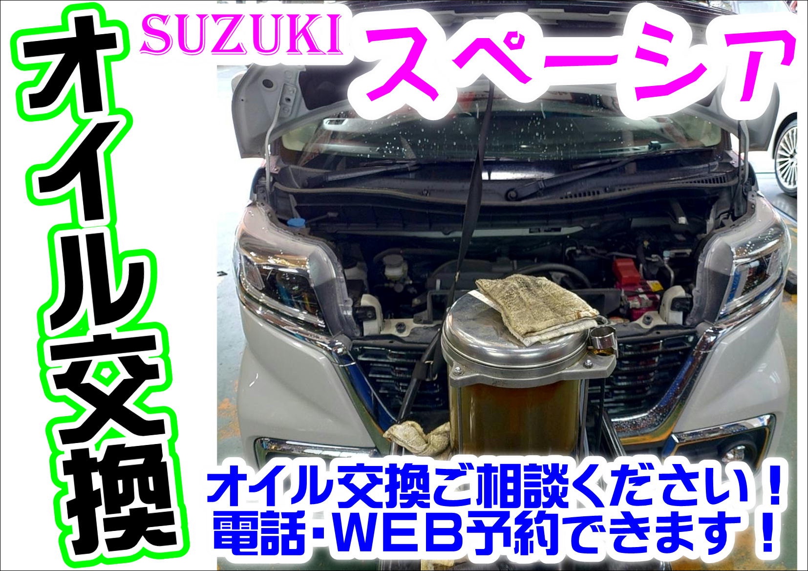 当店HPを見て!【WEB日記を見て初めてのご来店】スズキ スペーシア《エンジンオイル交換》※お出かけ後の、お車の点検はされてますか?只今、無料点検実施中です!