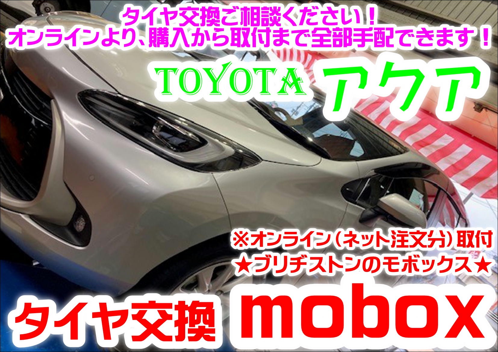 ※ブリヂストンタイヤ "mobox(モボックス)" 定額制で買えちゃう♪「アフターのメンテナンスも充実した内容付きの、定額利用サービス」で購入! トヨタ アクアのタイヤ交換 ※ そして「ブリヂストン タイヤオンラインストア」もございます♪(๑ᴖ◡ᴖ๑)♪