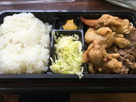 20周年記念祭をやっていて、この弁当「ステーキ&唐揚げ」でワンコインの500円!!
