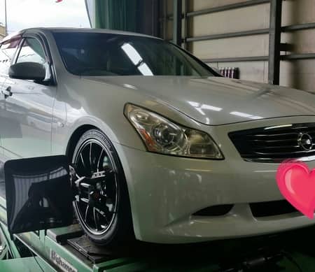 本日ご予約のスカイラインのタイヤ交換とアライメント調整を行いました。19インチのホイールにレグノを装着と羨ましい仕様になっています(^o^)