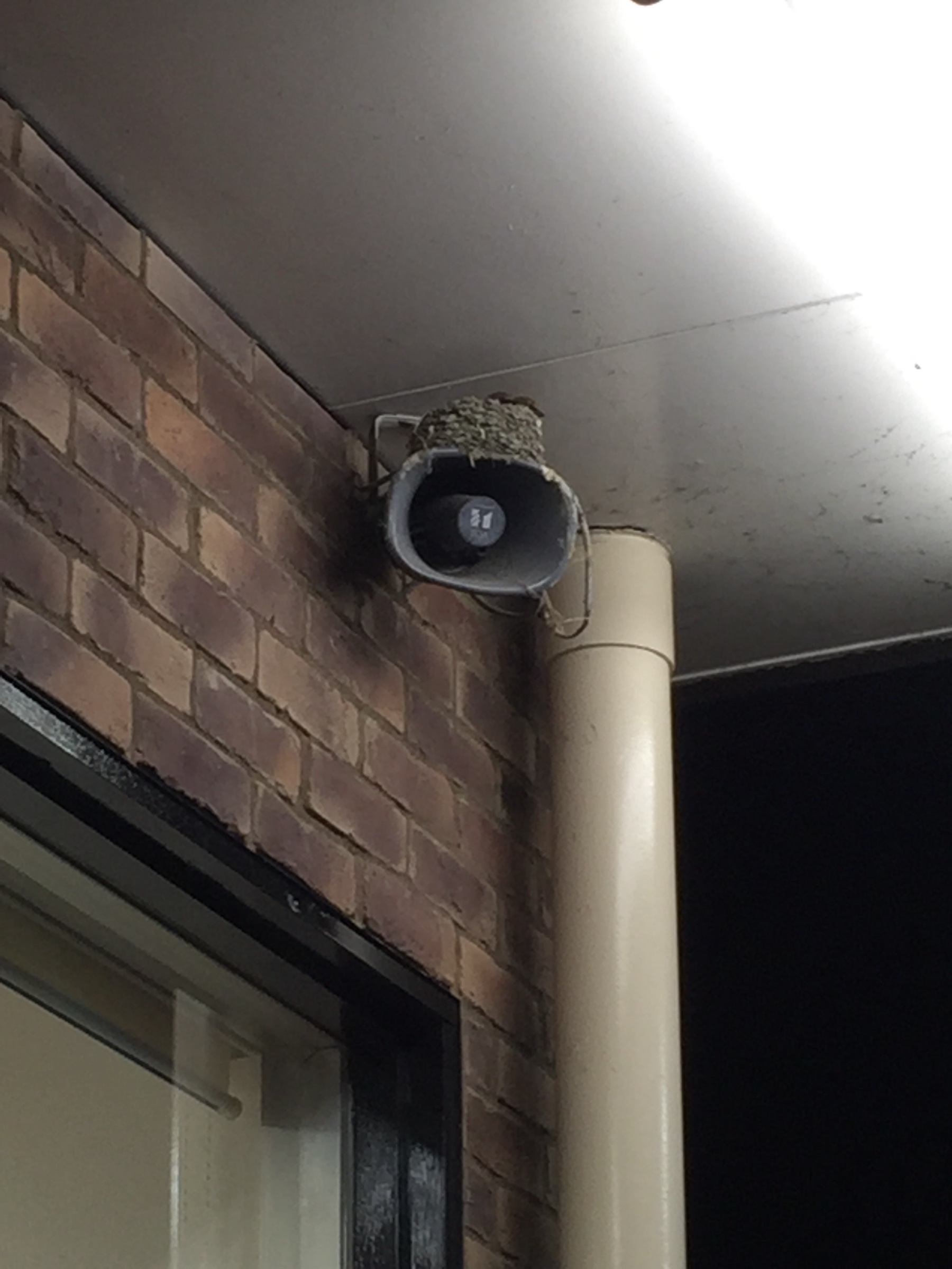 お店の喫煙所の上に去年から残っているツバメの巣があるんですが、そこにスズメが住みついています!!