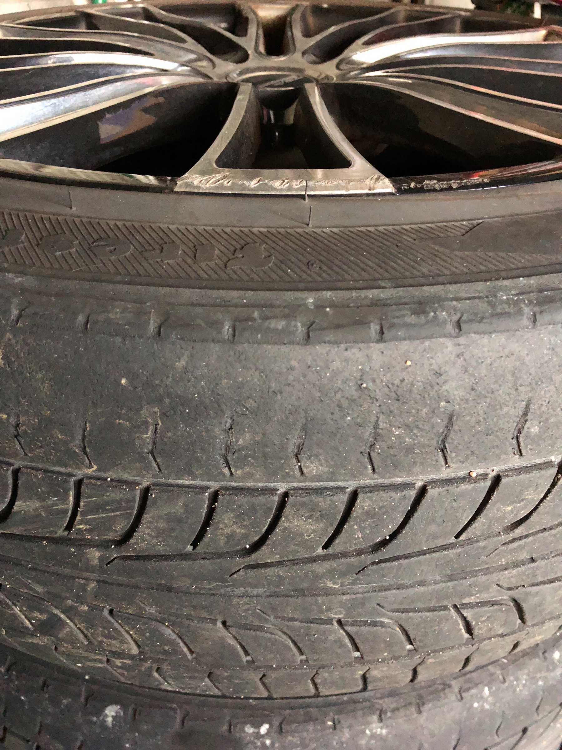 外したタイヤがこのように片側だけ減っていたので調整をバッチリさせて頂きましたよ^ ^