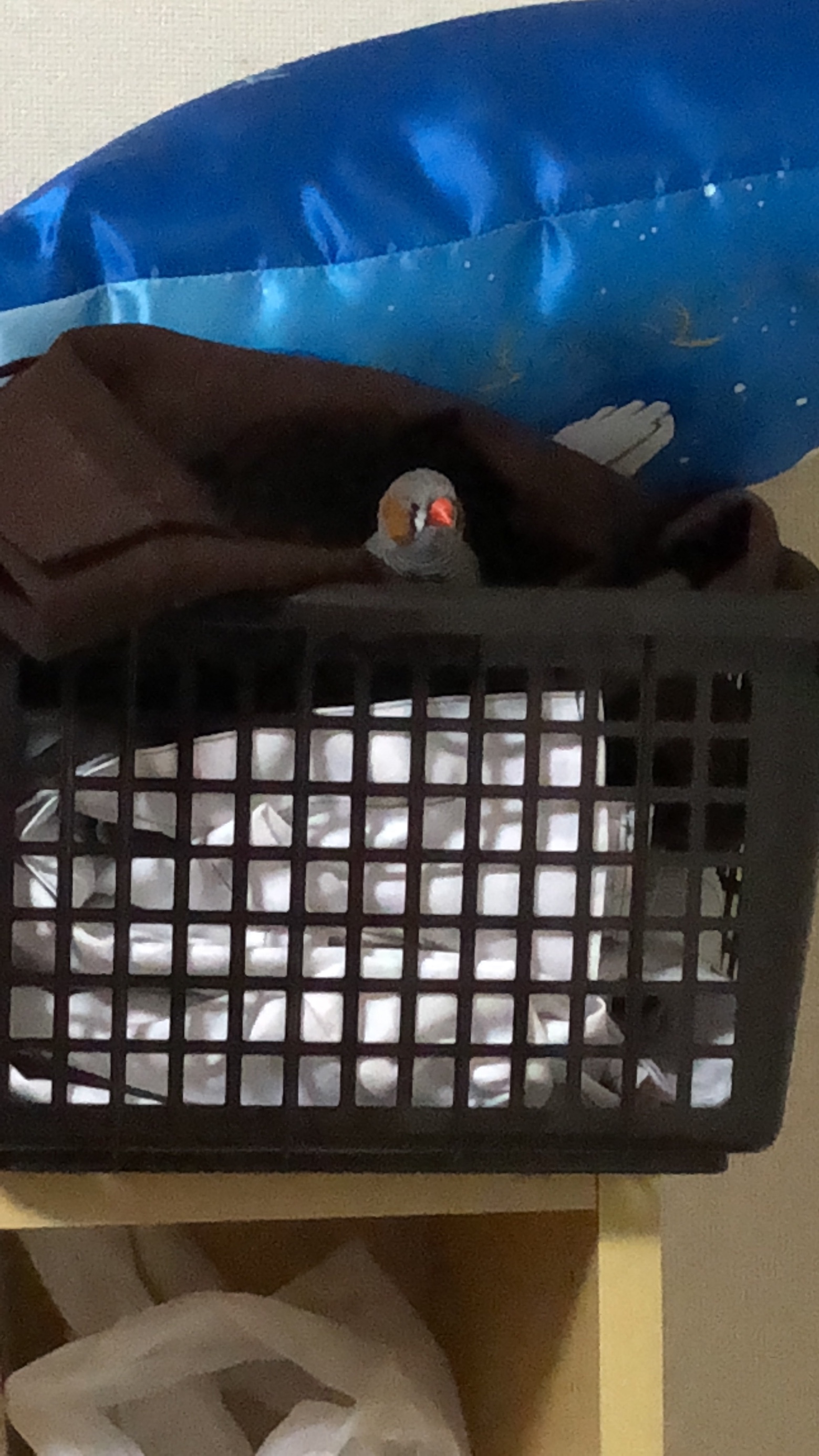 タイヤ館のユニフォームの上下置いてるスペースから視線を感じて見てみたらキンカチョウがひょっこりはん笑