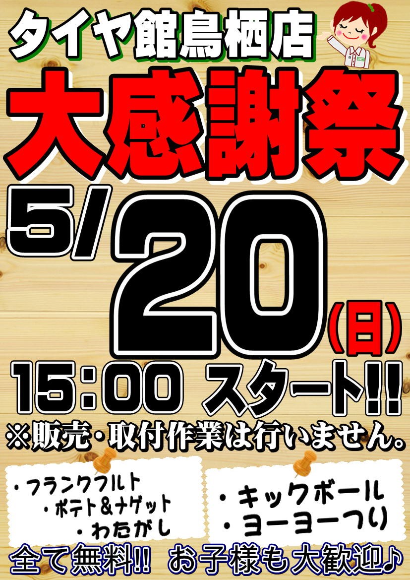 5月20日(日)は「大感謝祭」 ポスト 2018年5月10日 いつもタイヤ館鳥栖店のwebをご覧頂きありがとうございます! 5/20(日) 15時からタイヤ館鳥栖店にて『大感謝祭』を実施致します! 今回、初めての販売・取り付け一切無しの、無料イベントのみでの開催です。 まさに『大感謝祭』となっております! お子様向けのイベントも多数ございますので、ご家族でのご来店お待ちしております! 私たちと一緒に、楽しみましょ~(*^^*) カテゴリ:お知らせ