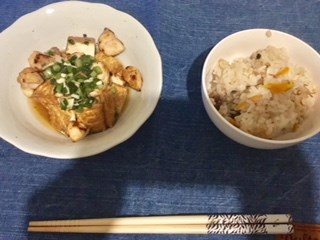 厚揚げとささみがあったので、それぞれ焼いてねぎ塩だれをかけたやつと炊き込みご飯です!