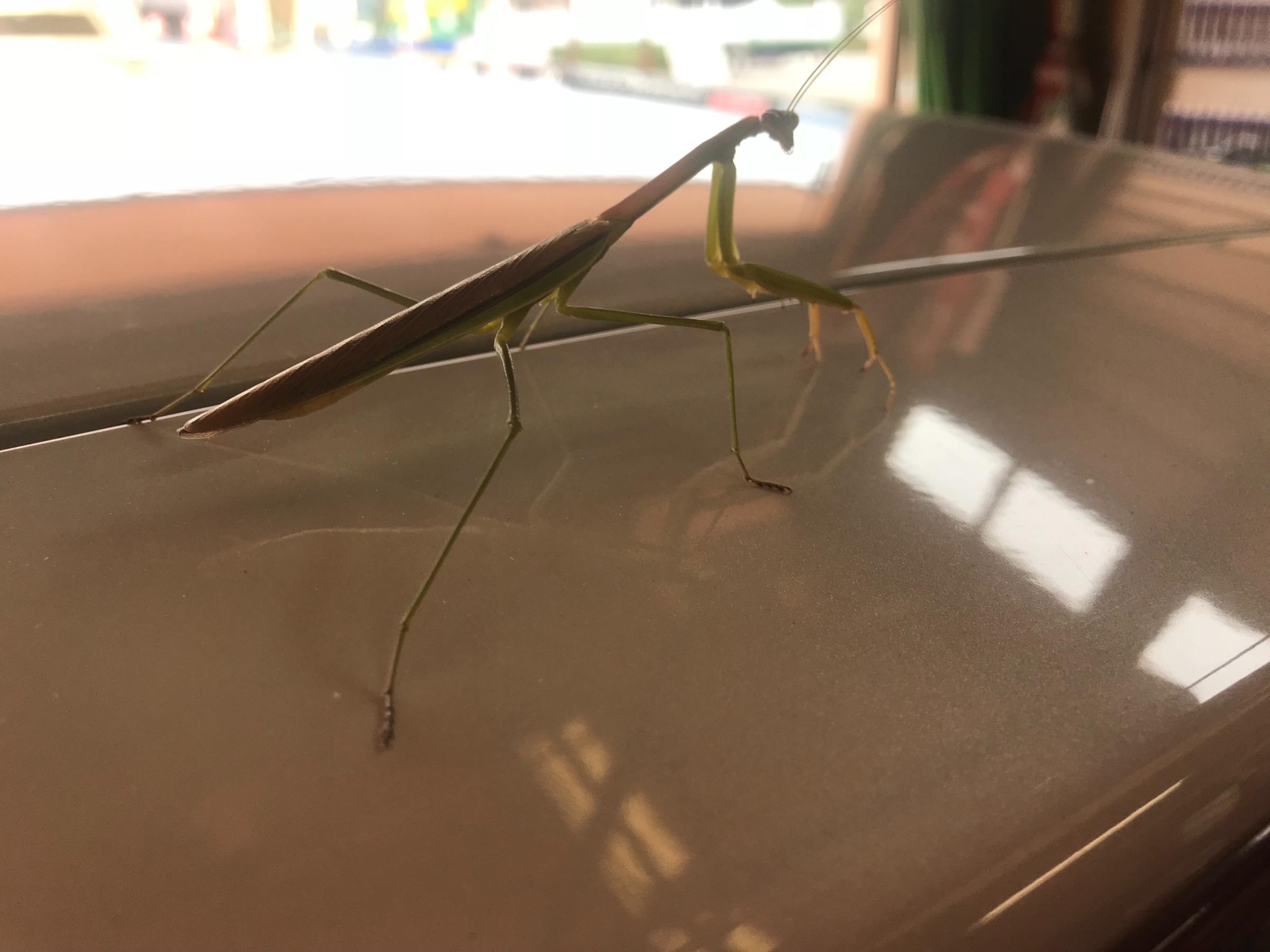 お客様の車を作業の為に移動させようとしたら車の上にカマキリがいました!