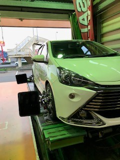 昨日縁石にぶつけてしまったとの事でお電話頂き、アライメント調整を行いました。