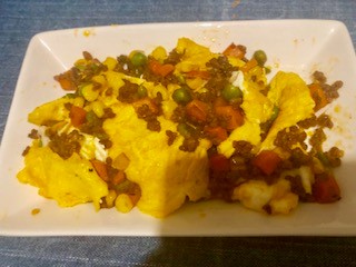 中の具は、グリンピース・人参・コーン・ひき肉を炒めてデミグラスソース風のソースで炒めておいしかったです♪