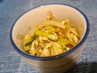 きゅうりともやしと玉ねぎと鶏むねをポン酢とごま油で和えたものです!