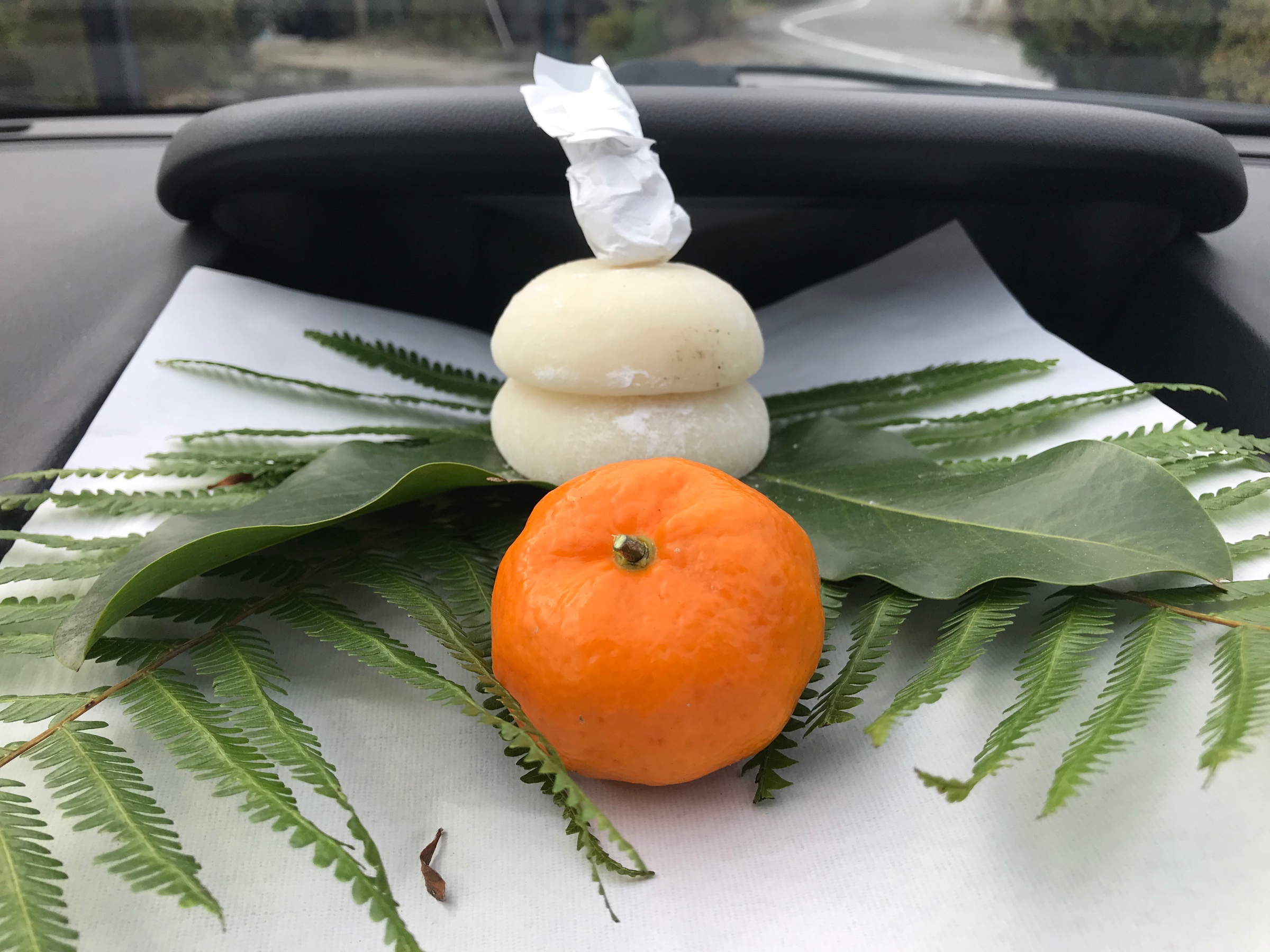 毎年自家製の餅を作ったのを小さいですが鏡餅にして車に飾りました( ^∀^)