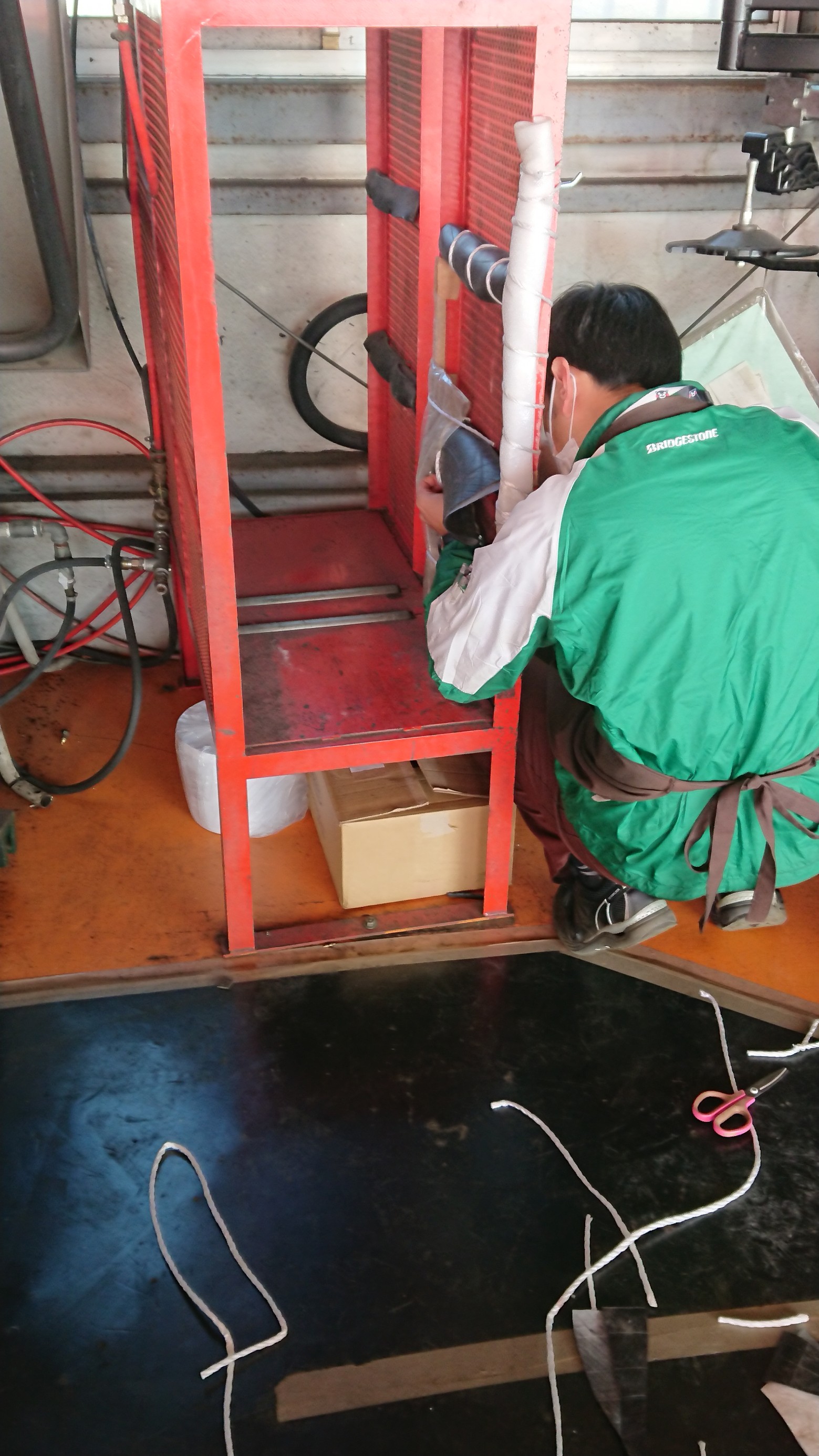 タイヤホイールに空気を入れる時に使う安全囲いなんですけど、お客様の大切なホイールに傷が入らないように、養生してます❗