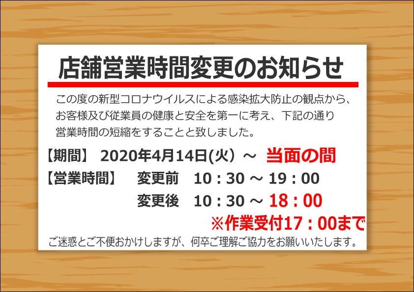 お客様及び従業員の安全と健康を第一に考え 営業時間を変更し営業 させて頂きます。