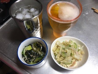 この日のお通しはマカロニサラダときゅうりとわかめの和え物です。