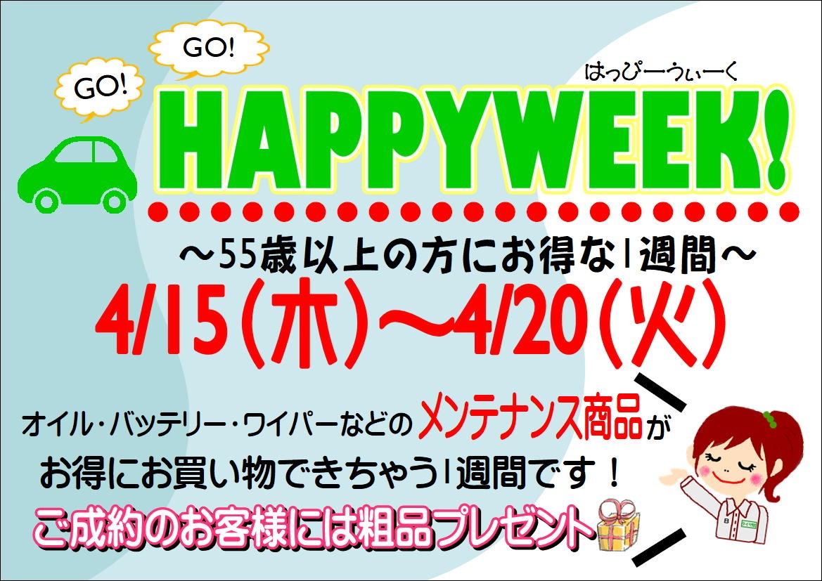 みなさまこんにちはタイヤ館鳥栖店です。 タイヤ館鳥栖店からお得な情報です☆ 4/15(木)から4/20(火)の1週間で 「GO! GO! HAPPY EWEEK!」を開催致します♪ この期間は55歳以上の方がお得にお買い物頂けます!! ☆★☆★メンテナンス商品は10%OFFです☆★☆★ ご購入ただいたお客様には粗品もご用意しており...