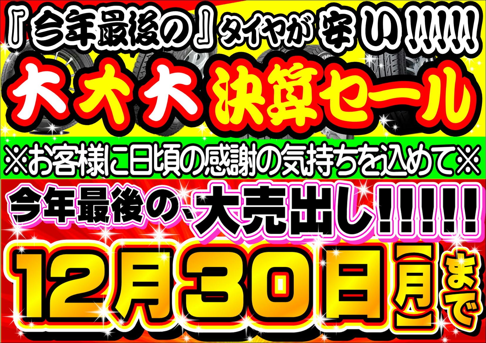 こんにちは!タイヤ館鳥栖店です! タイヤ館鳥栖店では、 来月から始まります、今年最後の大売出し情報です♪ 12月30日(月曜)まで、 『今年最後の『大大大決算セール』開催しちゃいまーす♪♪♪ 今年最後のラストセールになりますので、このチャンスにぜひぜひぜひ!!!!! 店内商品全商品がお得...