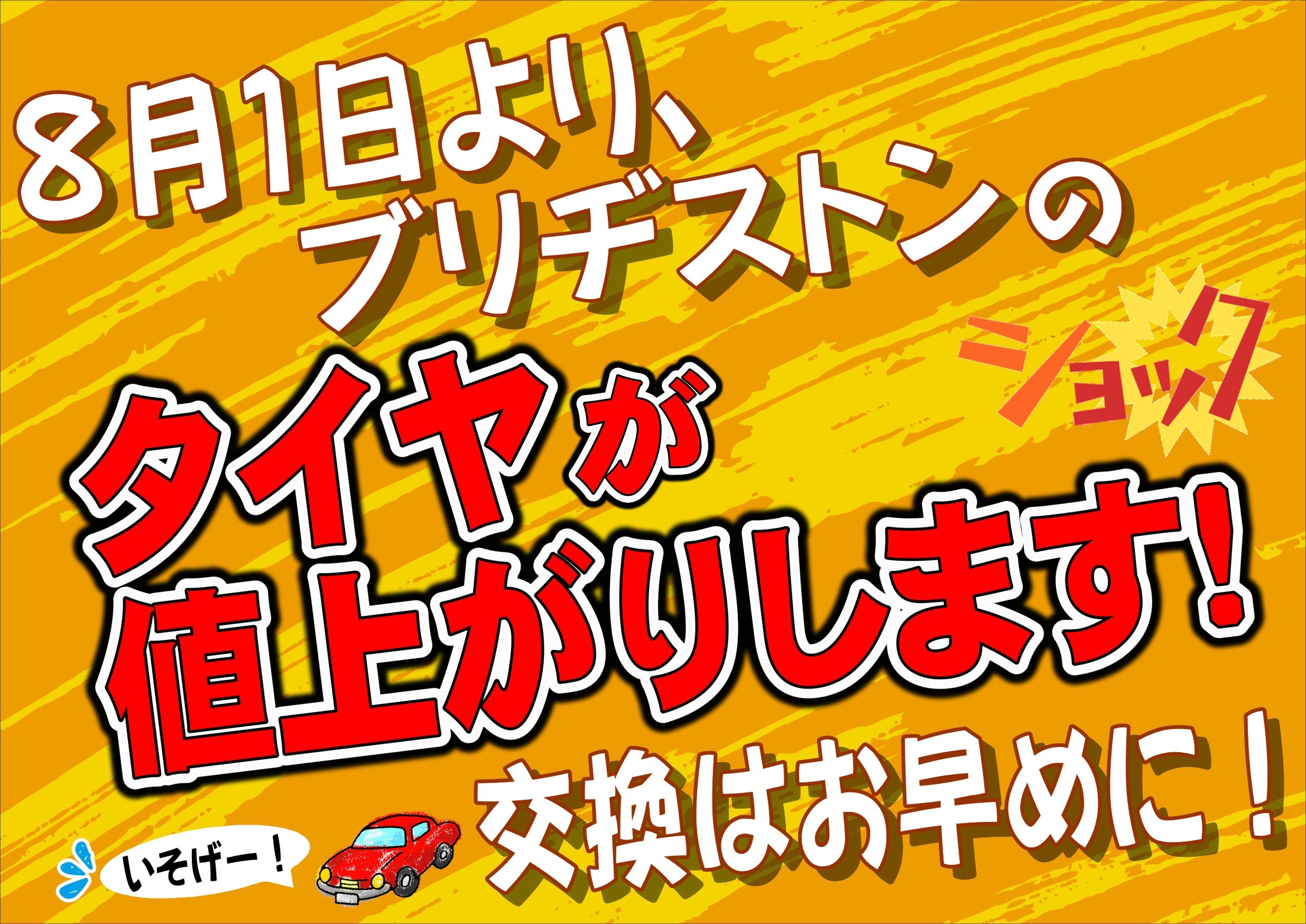 こんにちは! タイヤ館鳥栖店です! 大決算セール!&集中得市! を行います!!!! 6/22(土)から行います! タイヤがお得になります!!! 先日発表はありましたが、8/1からブリヂストンタイヤは値上げします。 さらにその先には増税もあります。 同じ商品を買うのに8/1までに買うのと秋ごろ買...