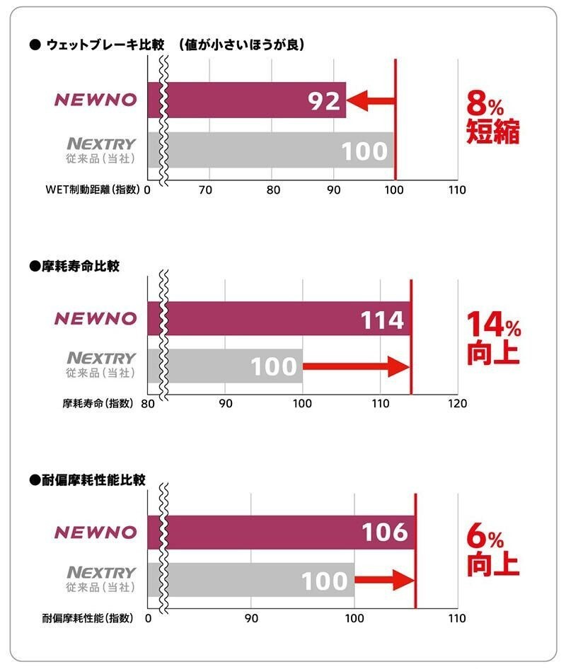 「NEWNO」はプレミアムブランドの商品に搭載されている技術を採用することで、通常は背反する関係にある低燃費性能とウェットグリップ性能、ロングライフ性能を高い次元で両立しています。