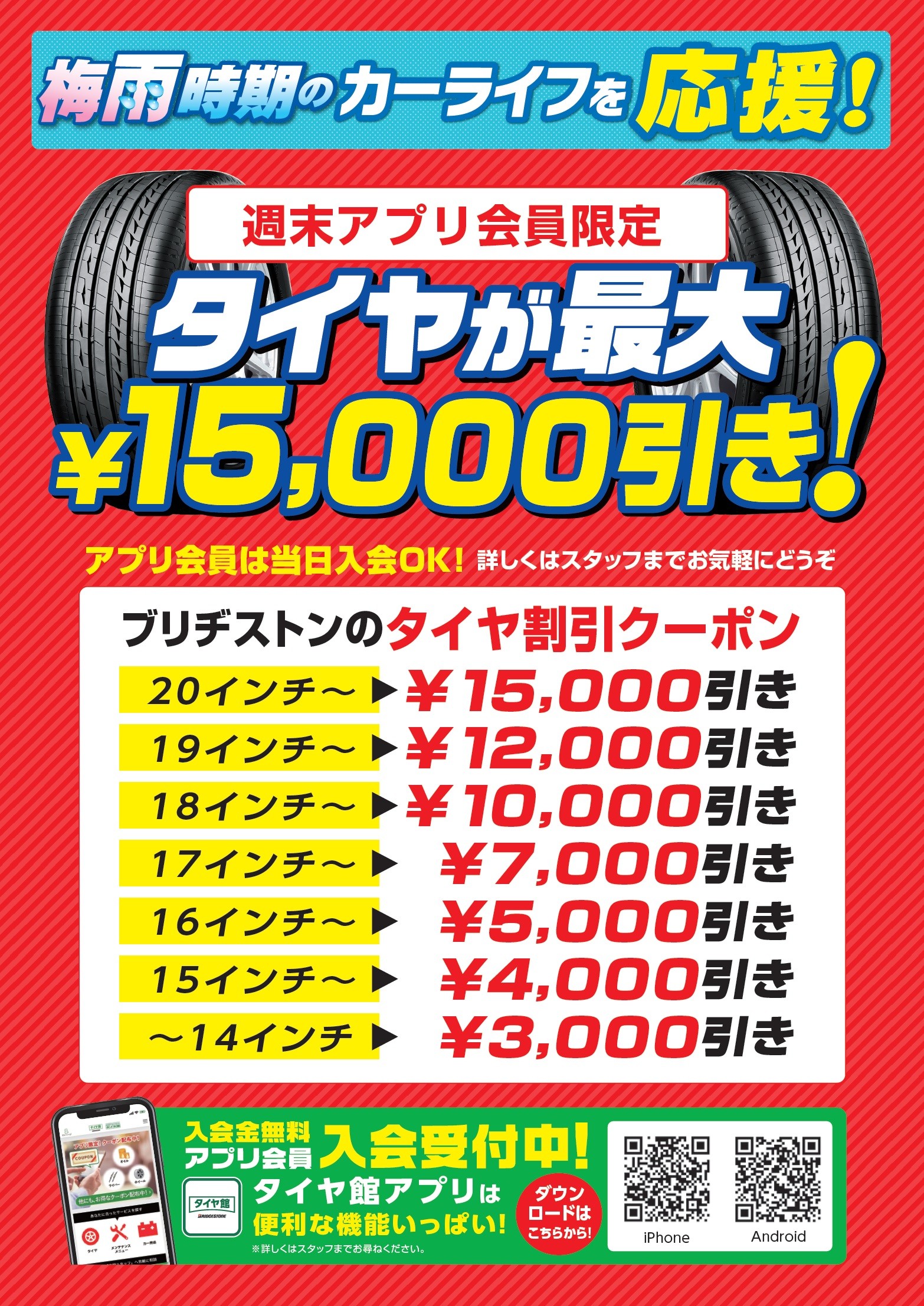 アプリ会員様はブリヂストンブランドのタイヤ4本ご購入で