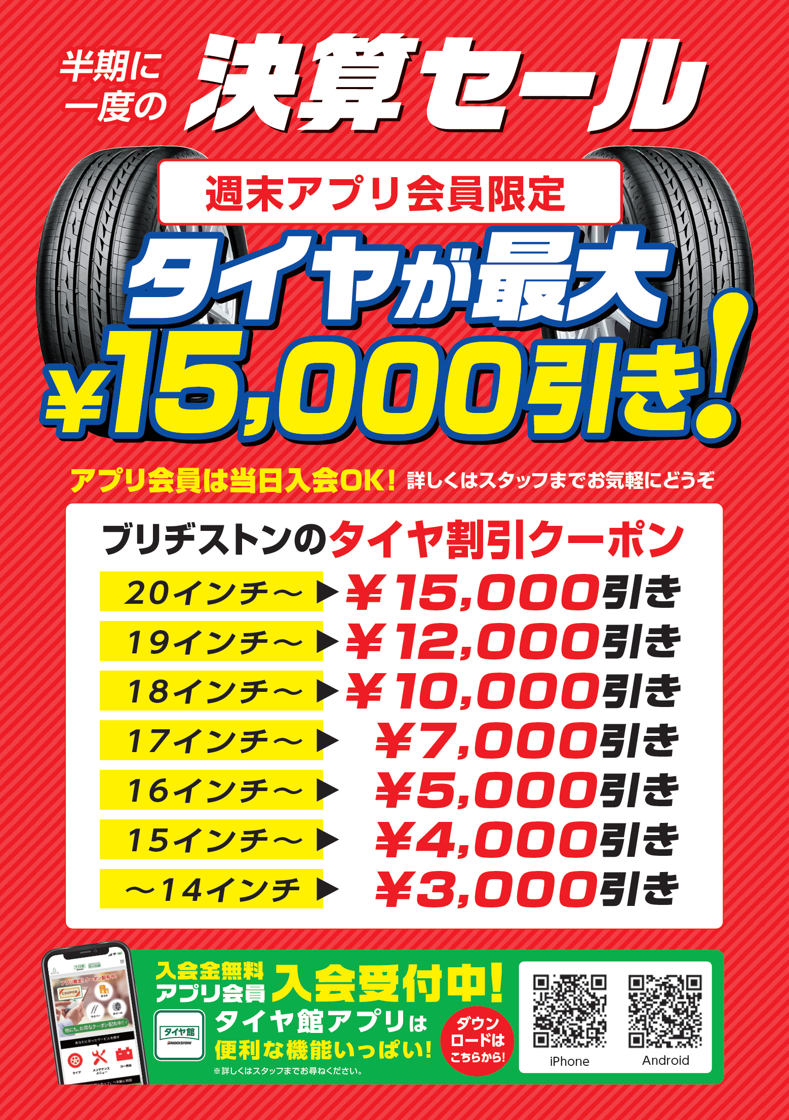 アプリ会員様はブリヂストンブランドのタイヤ4本ご購入で