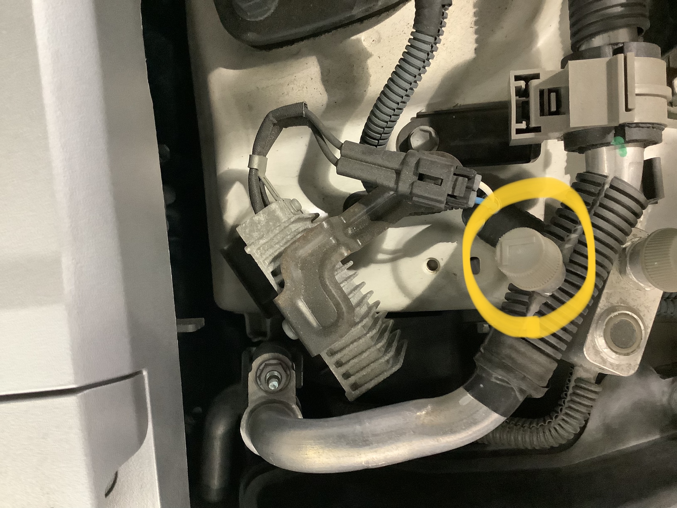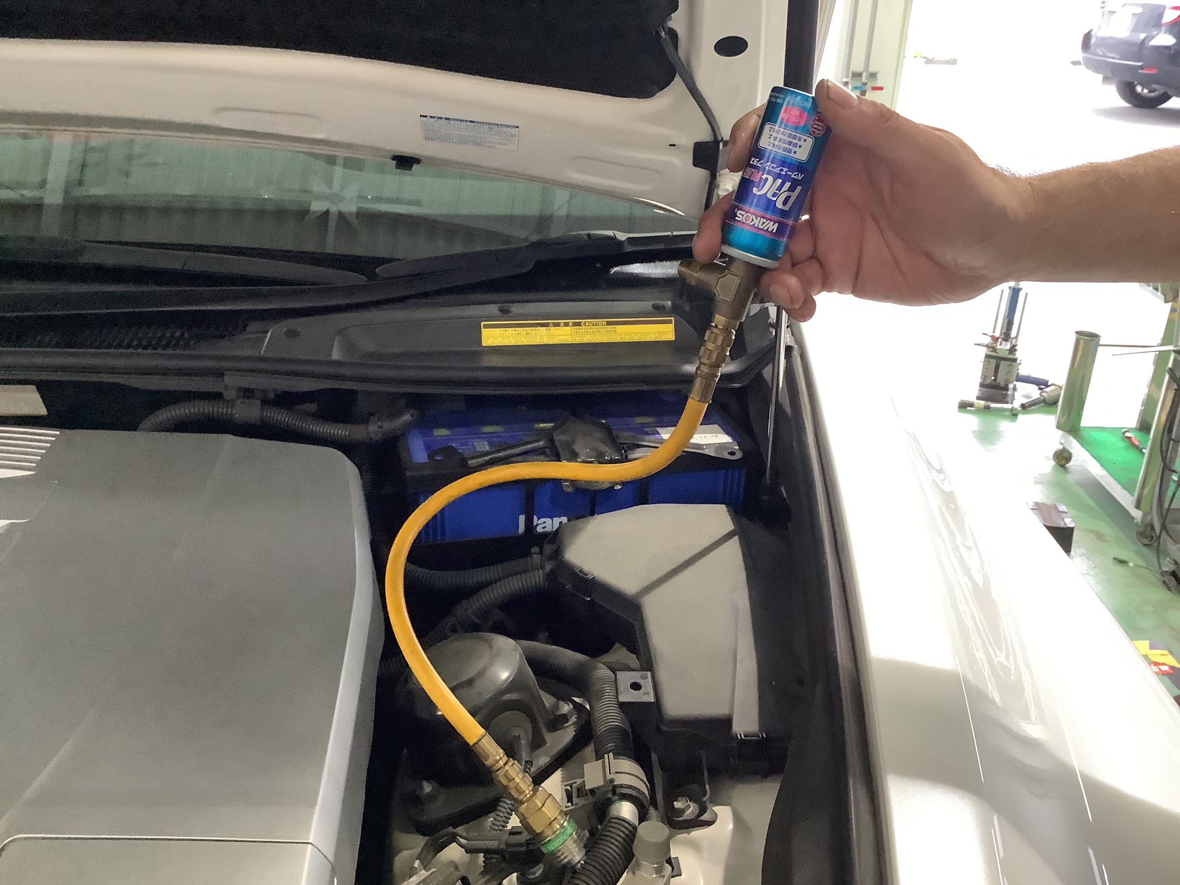 黄色の丸の部分の低圧側のバルブ部に配管を装着し、アタッチメントにエアコン添加剤を回して取り付け。
