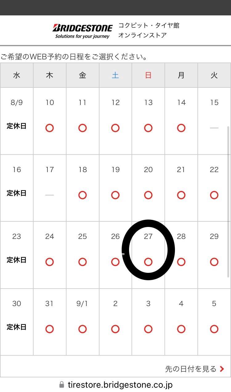 今回は、8月27日(日)を選択。日付をタップします。