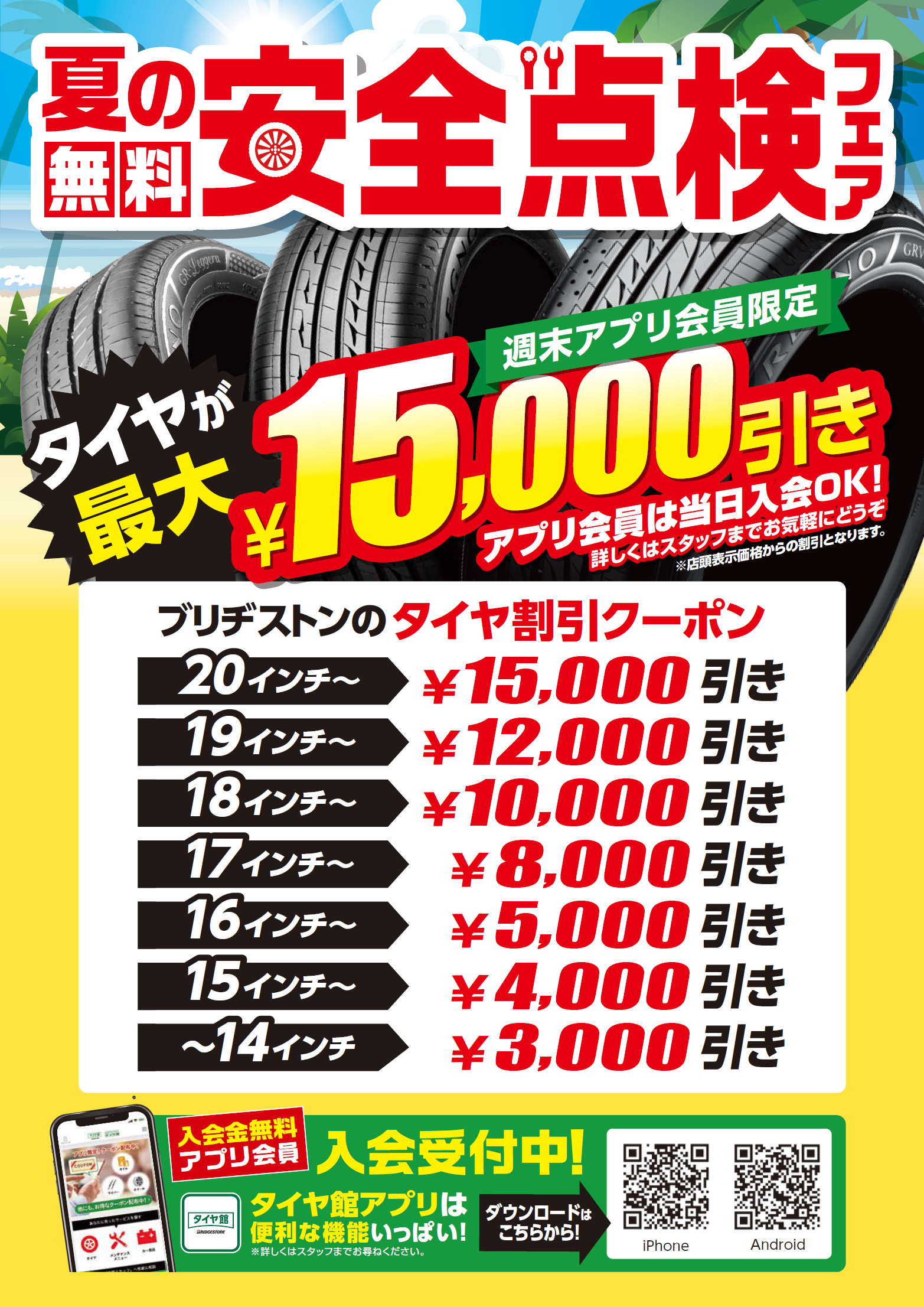 タイヤ4本ご購入で最大15,000円引きを実施します。