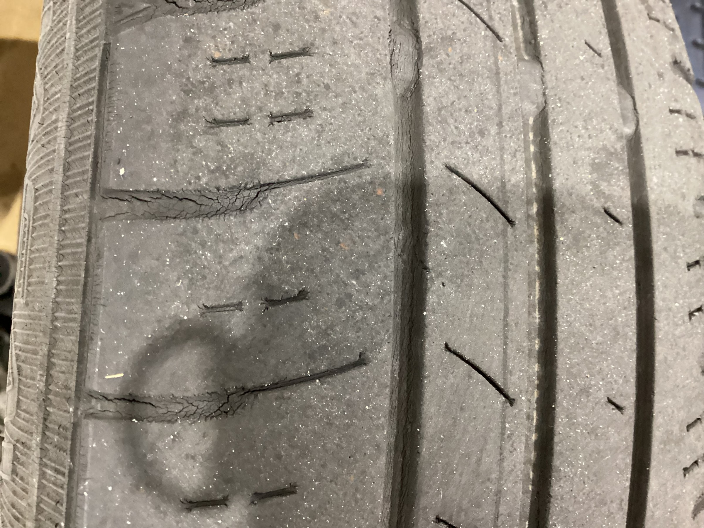 交換前のタイヤですが、かなりヒビが入ってきていて、溝が車検は、1.6ミリ溝がないと通らないですが、もう車検が通らないところぎりぎりだったので交換したほうがいいというお話をさせていただき交換していただきました。