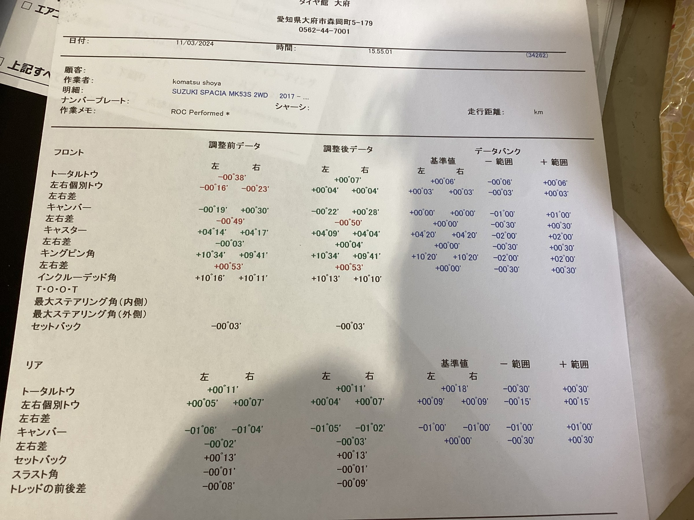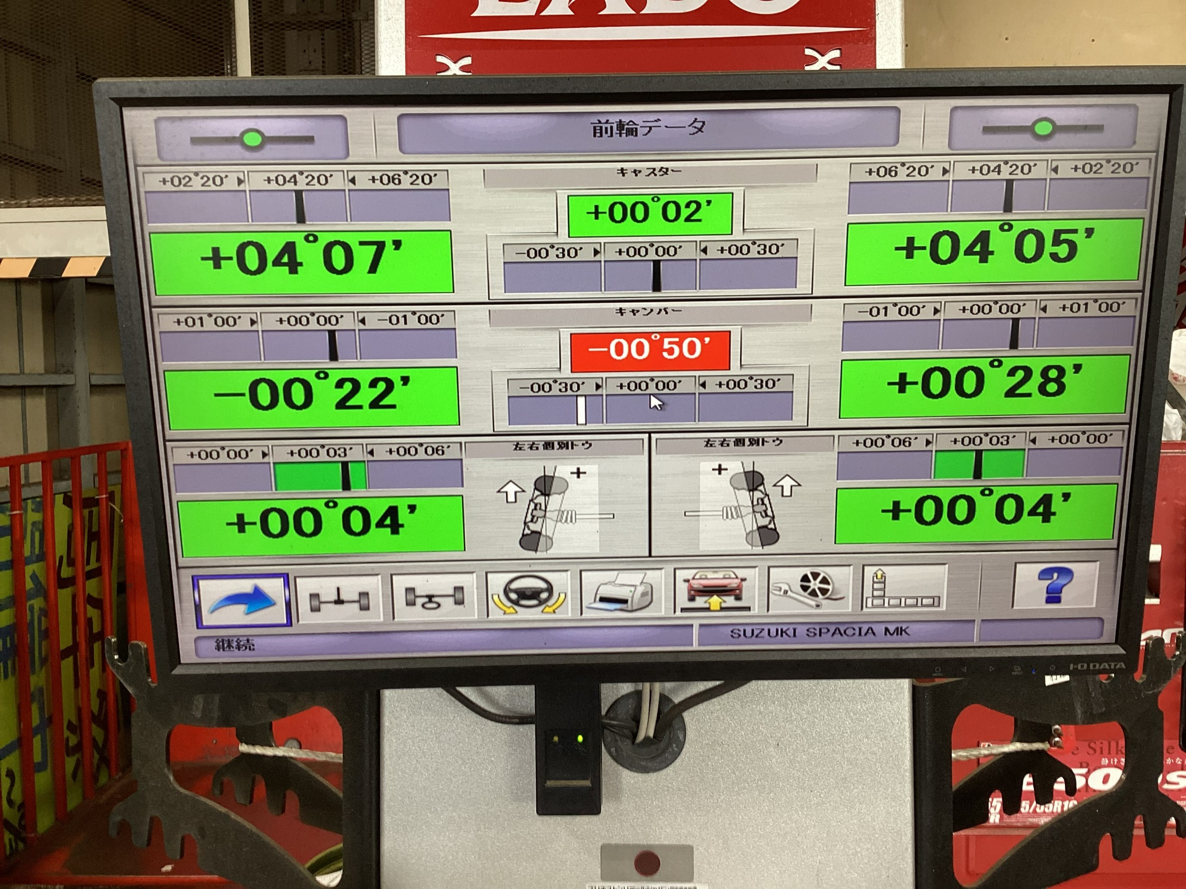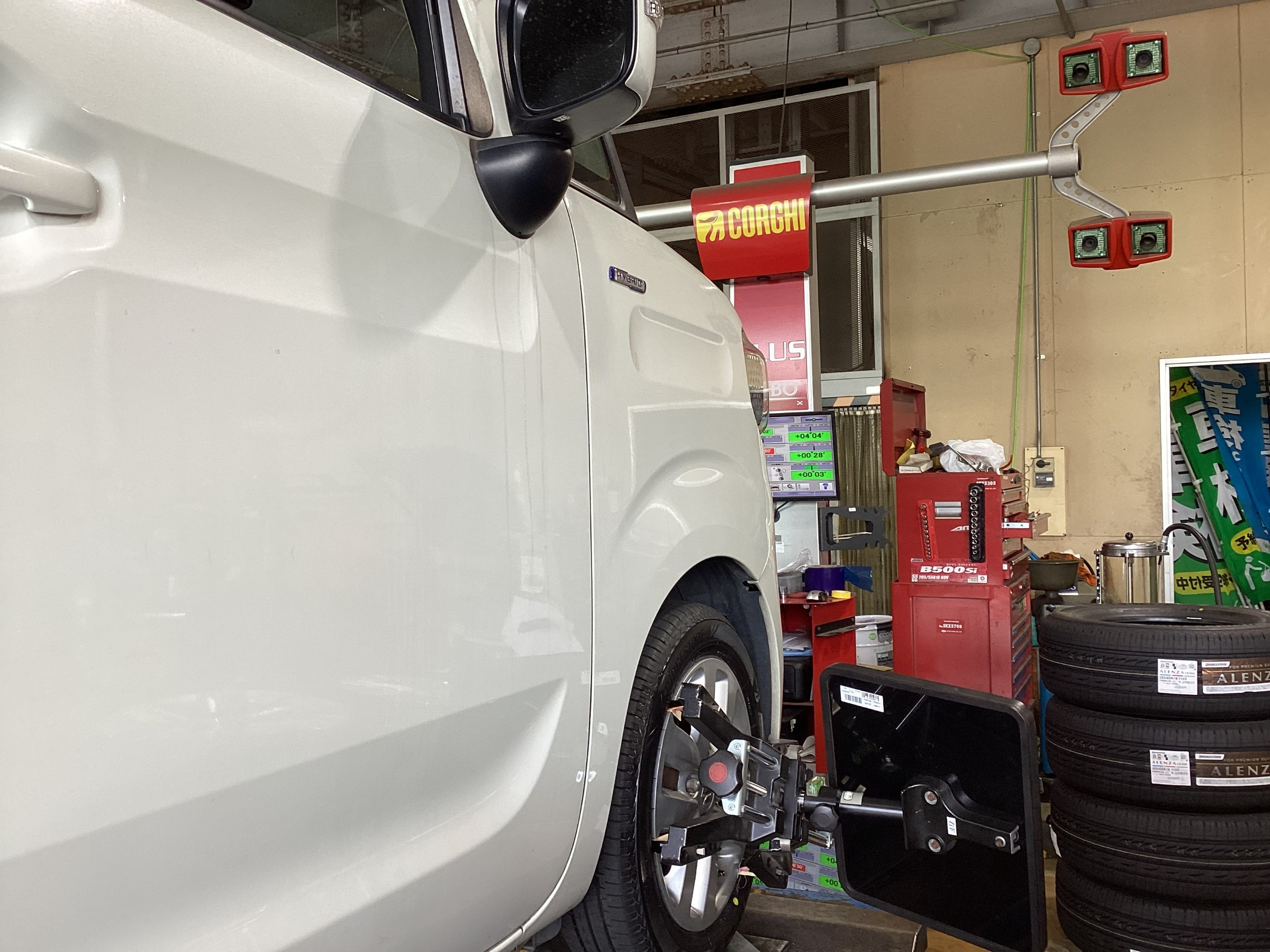 タイヤ館大府では、タイヤ交換をさせていただくお客様すべてにアライメント調整をご案内させていただいていて、今回やっていただくことになりましたので最後に、その風景と数値の写真を載せます。