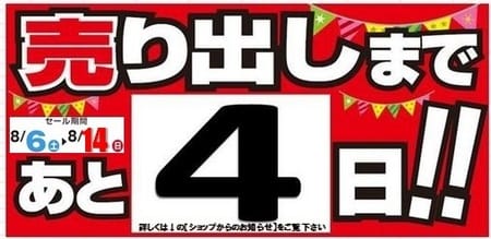 今週末 8月6日より売出しです!! ポスト 2016年8月2日 お世話になっております。タイヤ館豊橋向山店の原です!8/6~8/14にかけて売り出しを開催いたします!!お出かけ前のタイヤ点検やお出かけ前のお車のメンテナンスは、タイヤ館豊橋向山店でよろしくお願いします!皆様方のご来店スタッフ一同お待ち致しております!! 担当:原