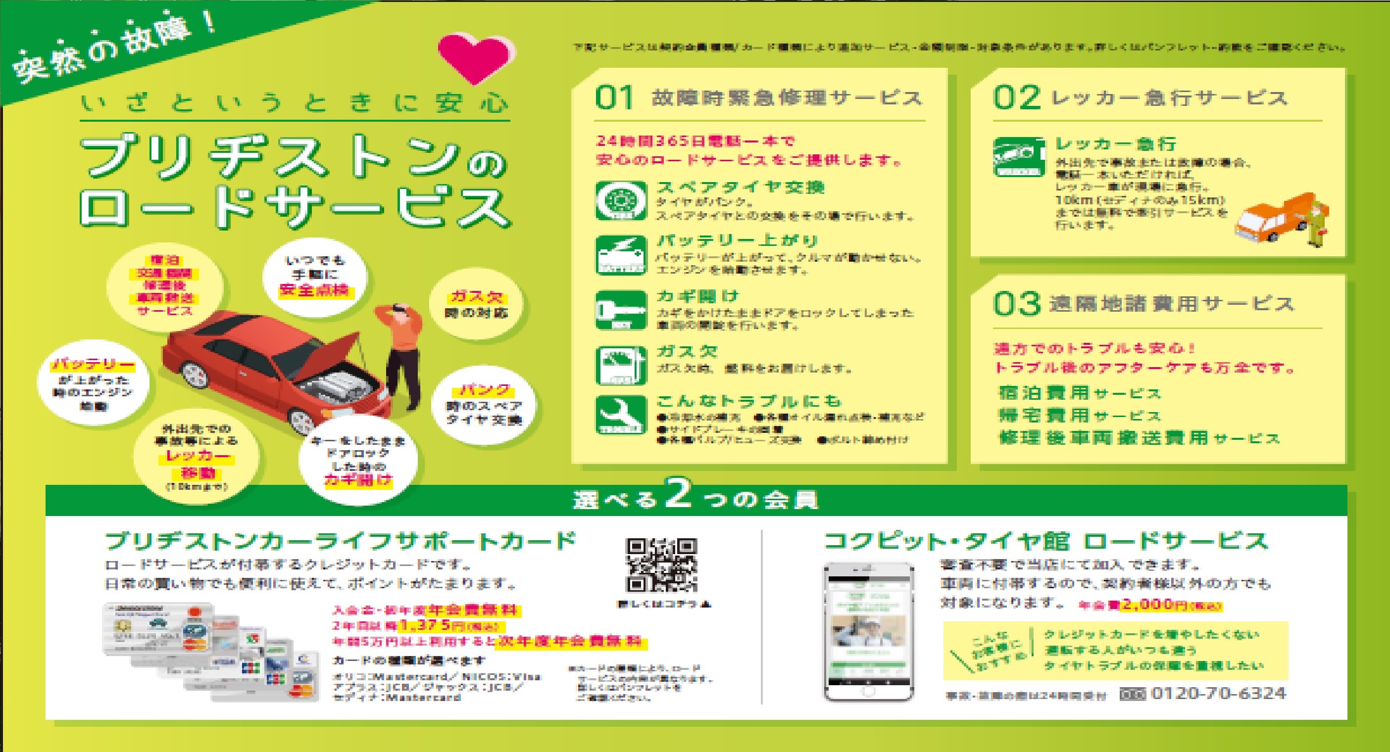 選べるブリヂストンのロードサービス! ポスト 2022年3月24日 いつもブリヂストンカーライフサポートカードのご利用有難う御座います。 現状、ブリヂストンのロードサービスを受けて頂く為に、 ブリヂストンカーライフサポートカードに入会が必要でした。 「クレジットカードは」って断念をされた方も少なくはないかと思います。 ブリヂストンのロードサービスは カード契約無しで、ご加入頂けます。 従来通りブリヂストンカーライフサポートカードでの入会はもちろん ロードサービス単体のご入会は審査不要で入会頂けるようになりました。 その名は・・・「コクピット・タイヤ館 ロードサービス」です!! 詳しくは当店スタッフまでご相談ください。 カテゴリ:お知らせ