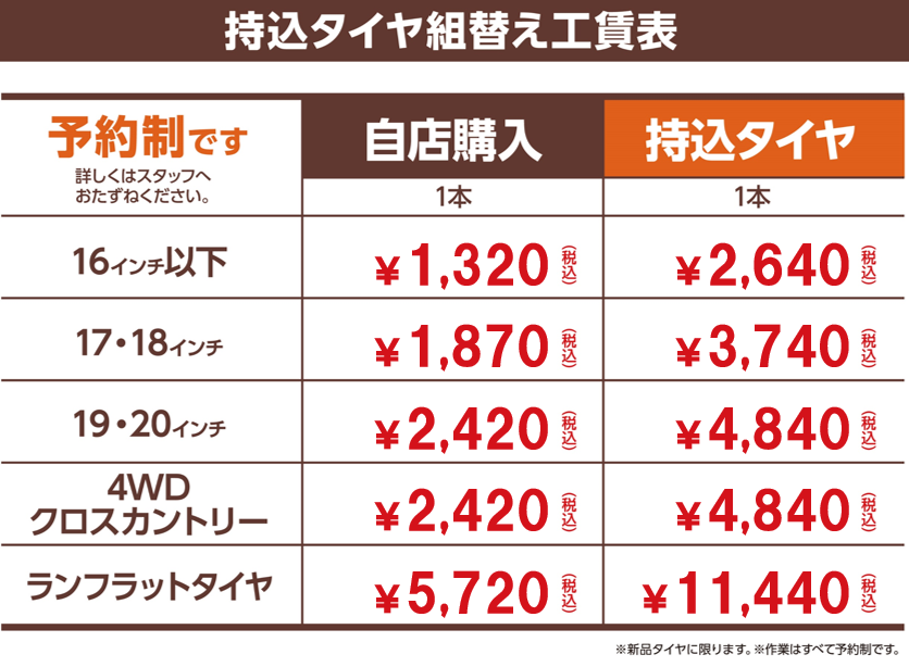※作業に関しましては、新品タイヤのみとさせていただいております。