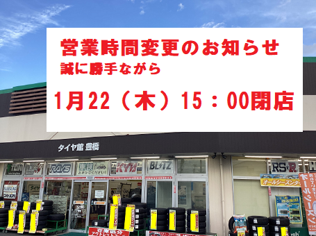 営業時間変更のお知らせ! ポスト 2026年1月17日 お世話になっております。 豊橋市新栄町にありますタイヤ館豊橋です。 誠に勝手ながら 1月22(木)の営業時間 10:30~15:00とさせていただきます。 翌日1月23(金)から通常営業となります。 お客様にはご不便をおかけしますが ご理解の程お願い致します。 カテゴリ:お知らせ