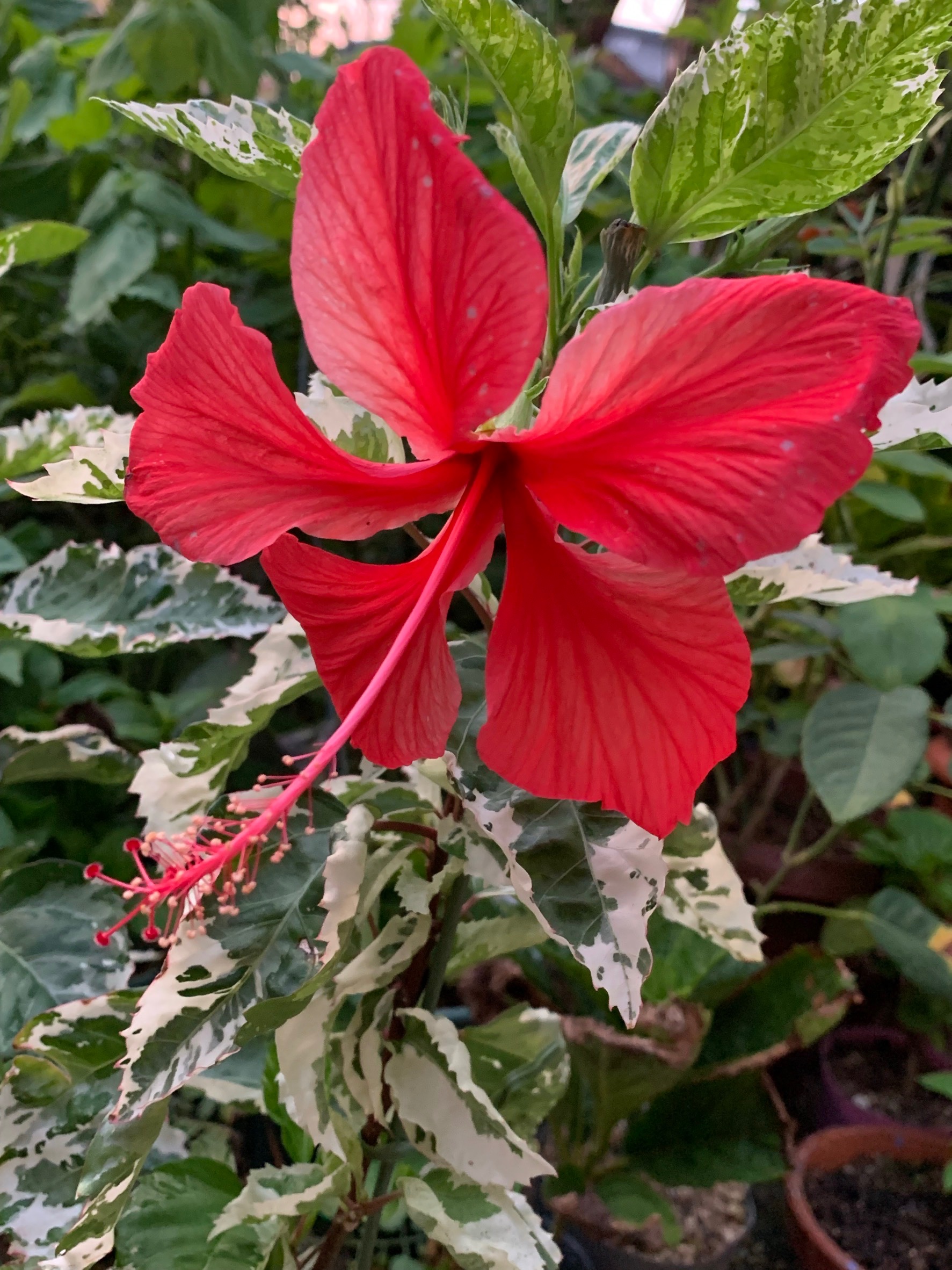 ハイビスカス ポスト 2025年7月26日 今日は当店の事務スタッフが大切に育ている植物のご紹介です(*^▽^*)一発目のご紹介はコチラ!斑入りのハイビスカス♪ そしてこちらは同じ株が突然変異で違う色の子が出てきたみたいです( ̄(工) ̄) また定期的にご紹介していきます♪