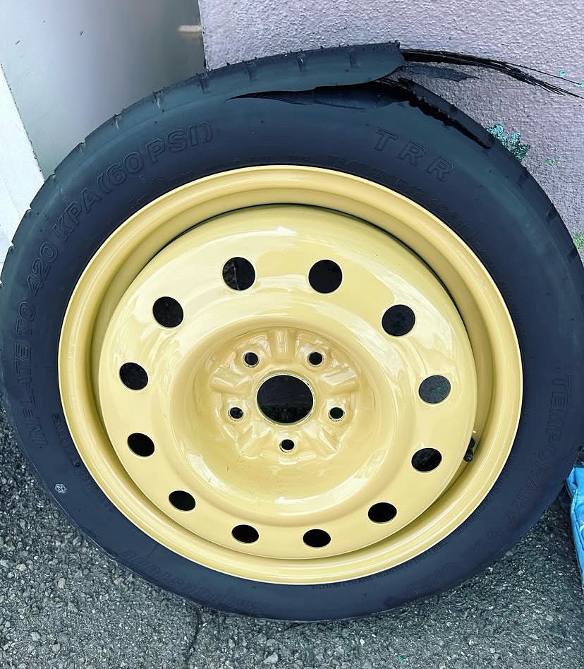 スペアタイヤ ポスト 2025年8月21日 最近ではスペアタイヤが初めから装備されてない車も増えてきていますがスペアタイヤが装備されてる車の方はスペアタイヤの点検はされていますか??(^^) 使ってなくても空気圧が少なくなりますしいざ使おうとした時にタイヤが傷んでいたりして使えない事もあるかもしれません‼︎ちなみに写真のスペアタイヤはバーストしています(u_u) 当店ではスペアタイヤの定期的な点検もおすすめしておりますのでお気軽にお越しください♪