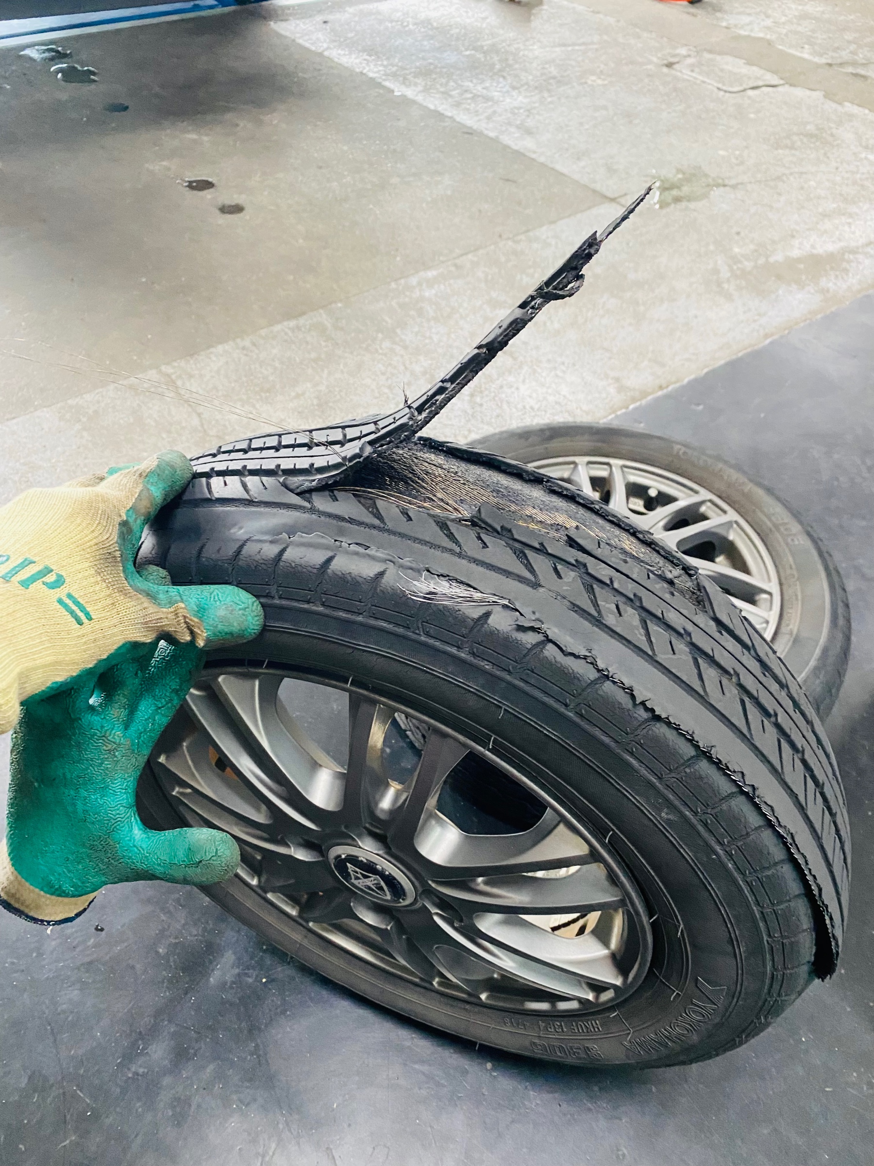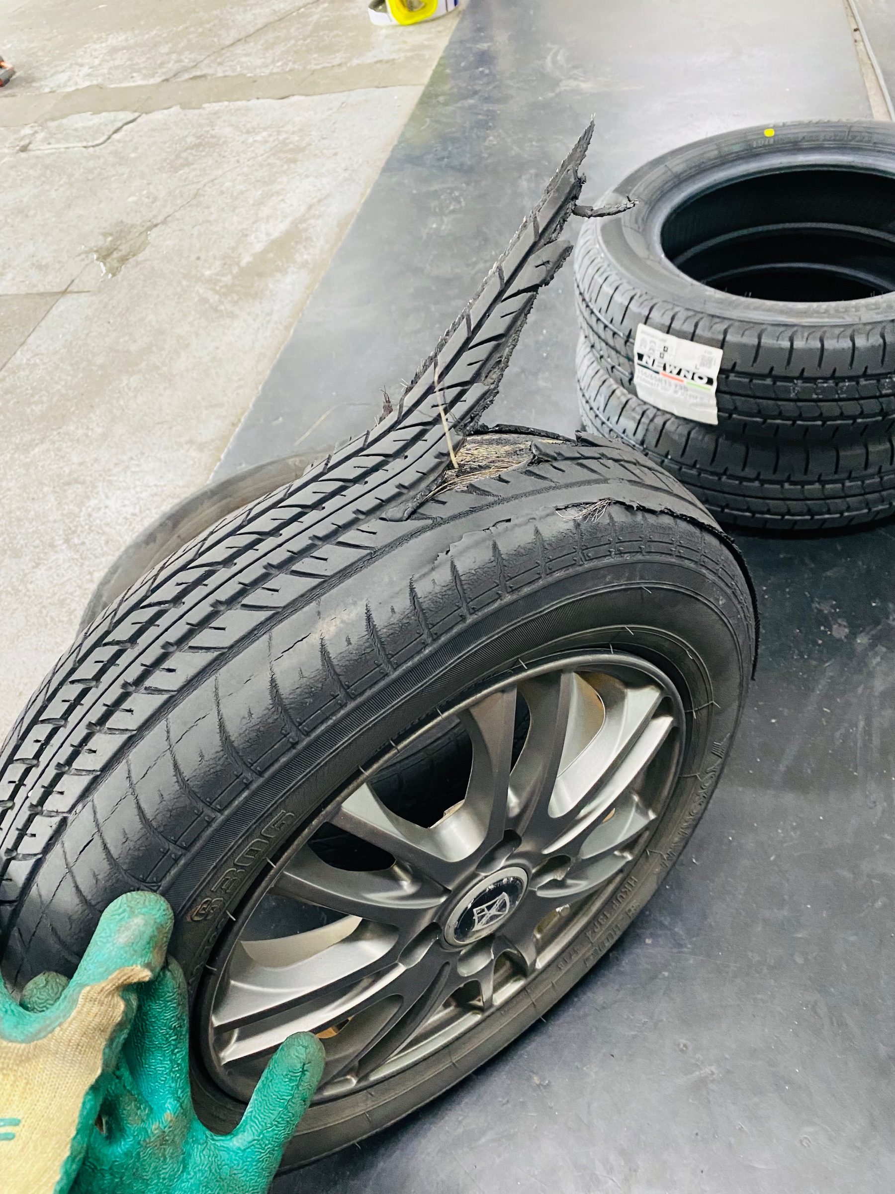 バースト寸前 ポスト 2025年9月12日 本日は走行中に違和感を感じたお客様がご来店!タイヤを点検した私達もびっくりしました‼︎ タイヤは変形し、路面と接地する部分は剥がれてしまっていましたΣ(゚д゚lll) 何より怖いのが、この状態でもタイヤの中にはまだ空気が入っていたので普通に走行できていた事です! ドライバー様が違和感に気付き、バースト前にタイヤ交換ができて一安心です(>_<) タイヤの点検はいつでも無料ですので、皆様も何か違和感があれば是非お気軽にお立ち寄りください‼︎