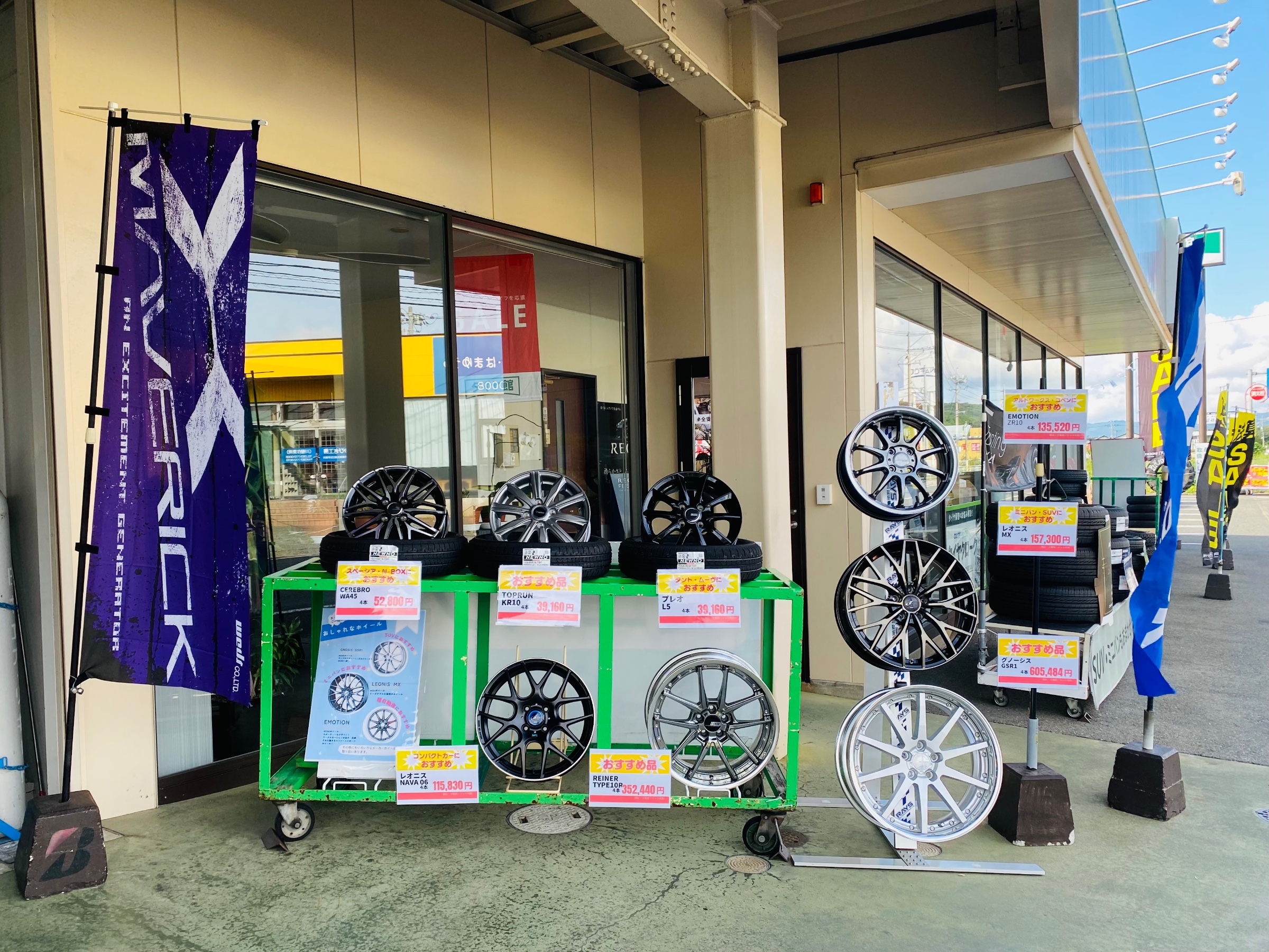 ホイール展示 ポスト 2025年9月14日 走行中の方にも見ていただける様に店内だけではなく、ロードサイドにもホイールを展示中です(*☻-☻*) さっそく何名かの方に『通りがかりに見て寄った』と嬉しいお言葉もいただけました♪ 店内にもホイールや足まわりも展示していますので気になった方はお気軽に見にきてください‼︎足元を変えると一気に愛車の雰囲気も変わって、いつものドライブが更に楽しくなるかもしれませんね(๑>◡<๑)