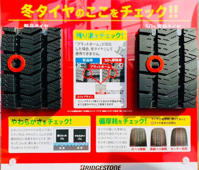 お持ちの冬タイヤが今年、使えるかどうか気になる方や不安な方はタイヤ館豊浦へお越しください( ^ω^ )
