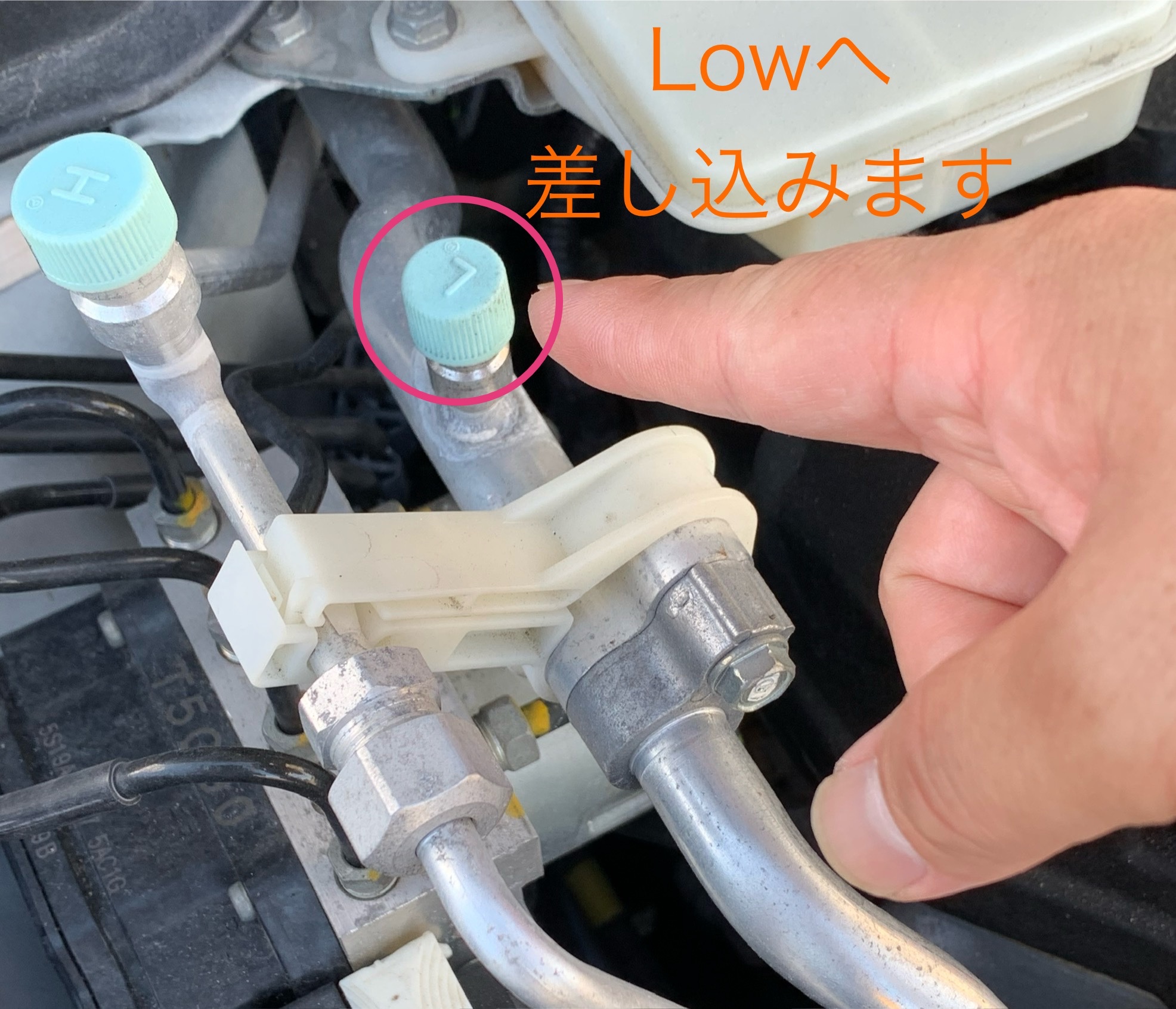 まずは車両のエアコン低圧側配管(Low)へガスチャージホースを取り付けます
