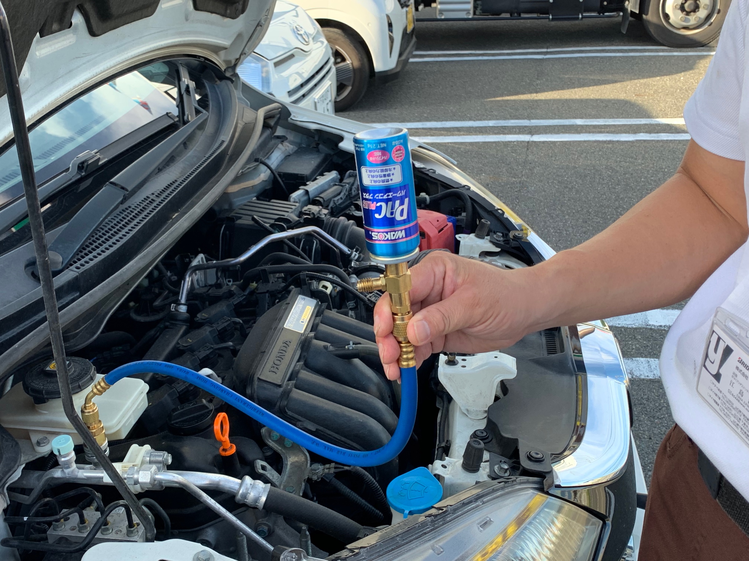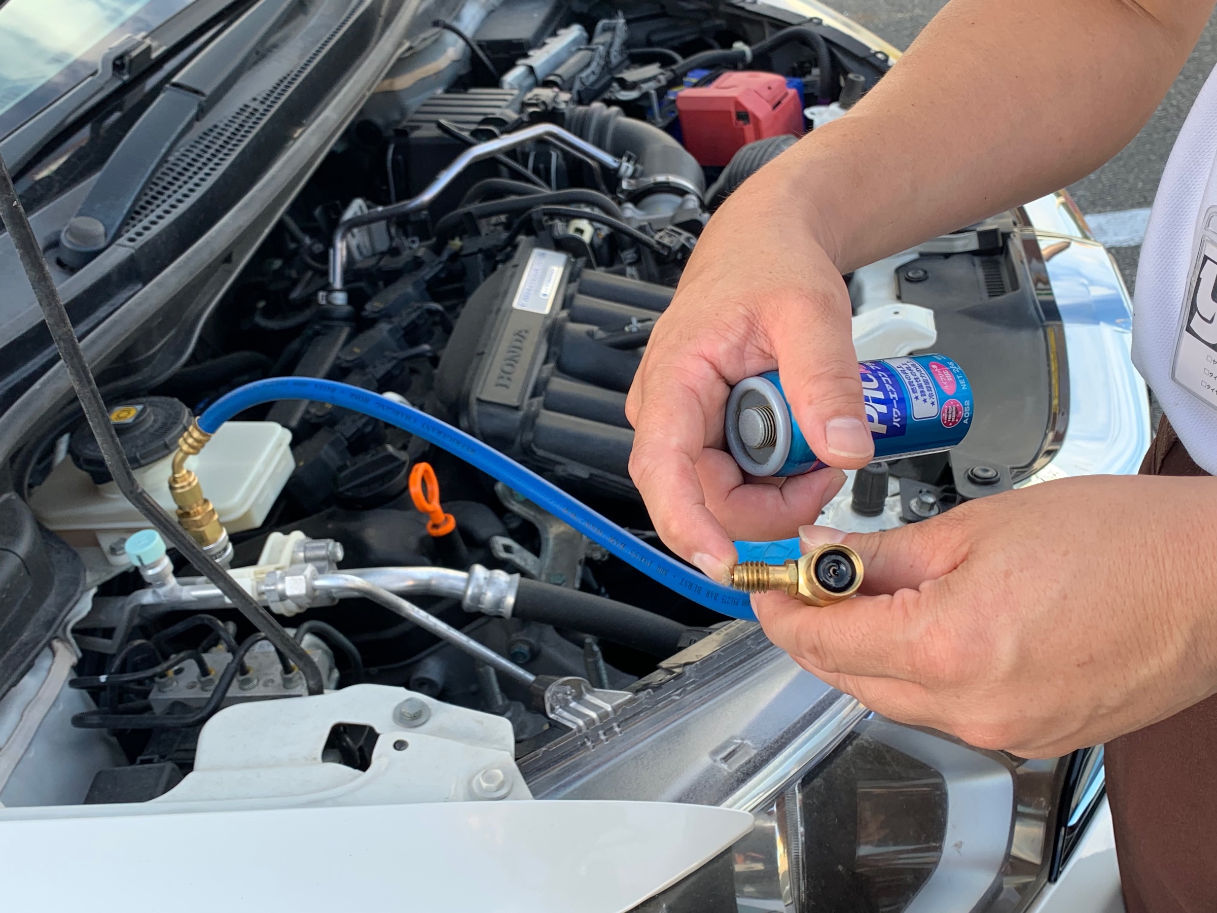 エンジンを始動し、エアコンを稼働させたらパワーエアコンプラスを充填。