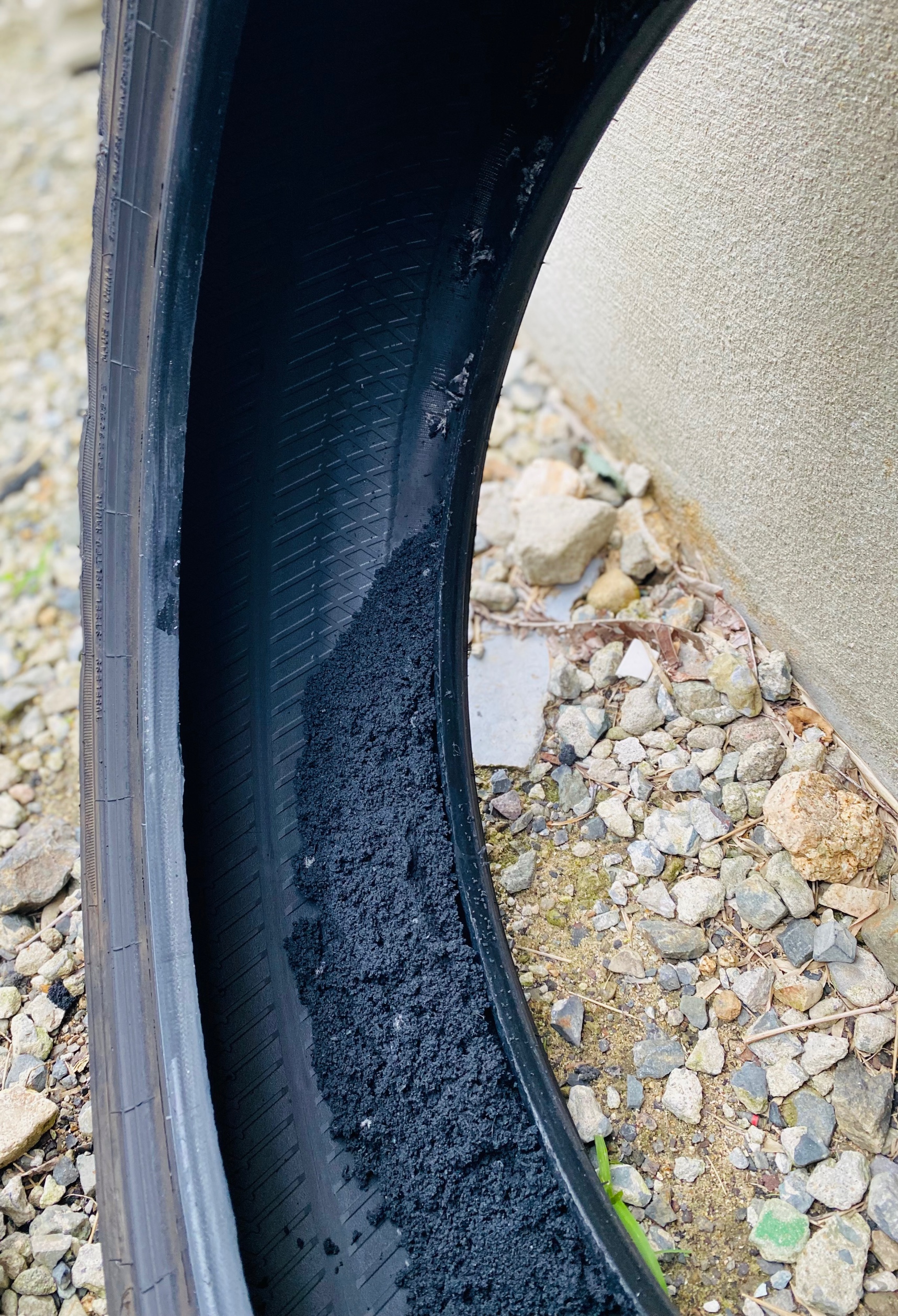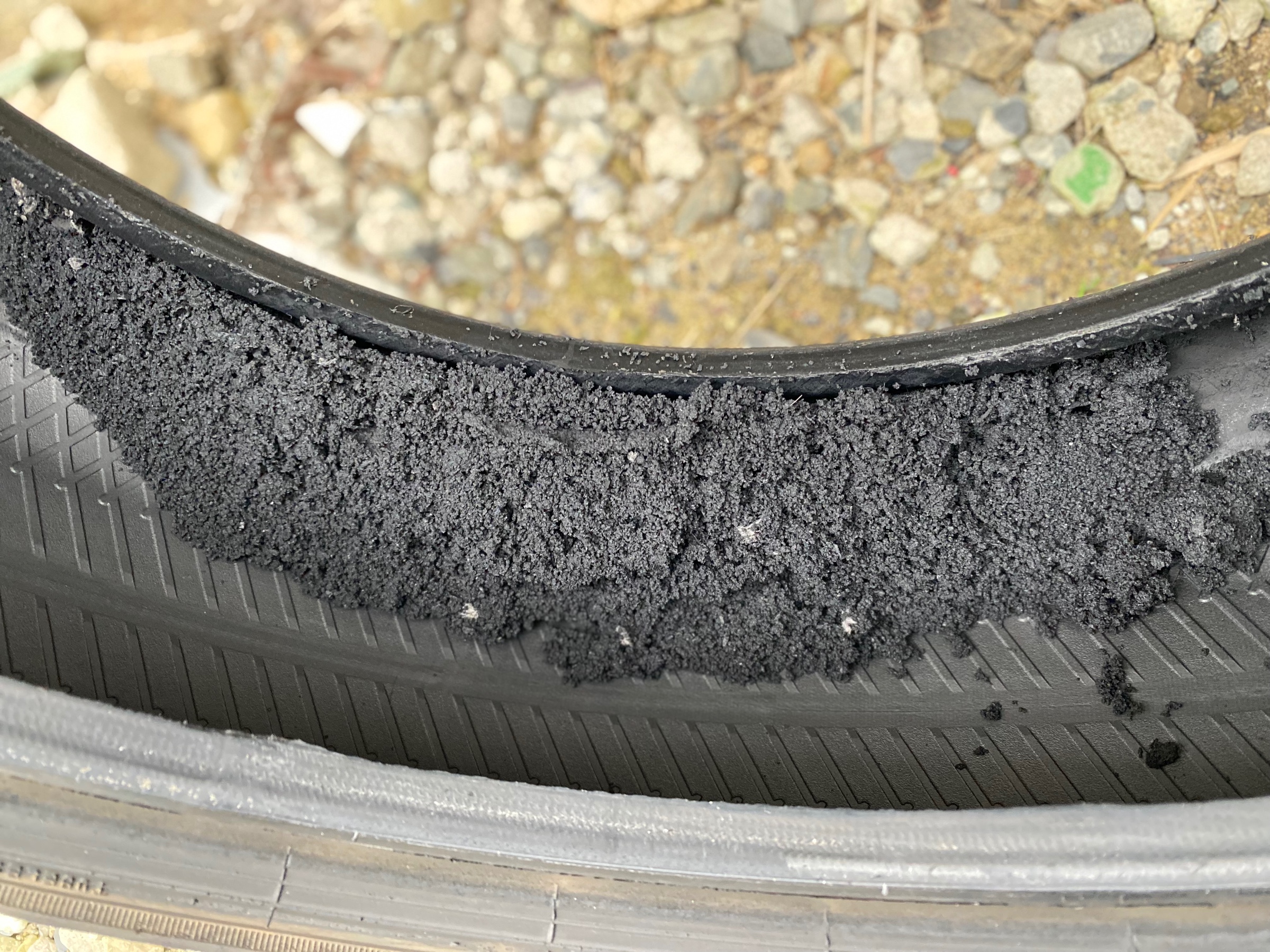 タイヤが潰れた状態で走ってしまった為、タイヤの横に穴が開き中もボロボロになってしまっていました。