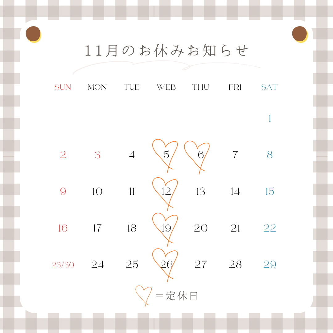 11月のお休みのお知らせ ポスト 2025年11月2日 11月のお休みのお知らせになります‼︎ 12月に入ると冬用タイヤへの付け替えが混雑する可能性がありますので早めのお取り付けをおすすめいたします♪ タイヤのお待ち帰りや保管に苦労されている方は是非、当店のタイヤクロークをご利用ください‼︎ ※タイヤクロークには別途費用が発生いたします。