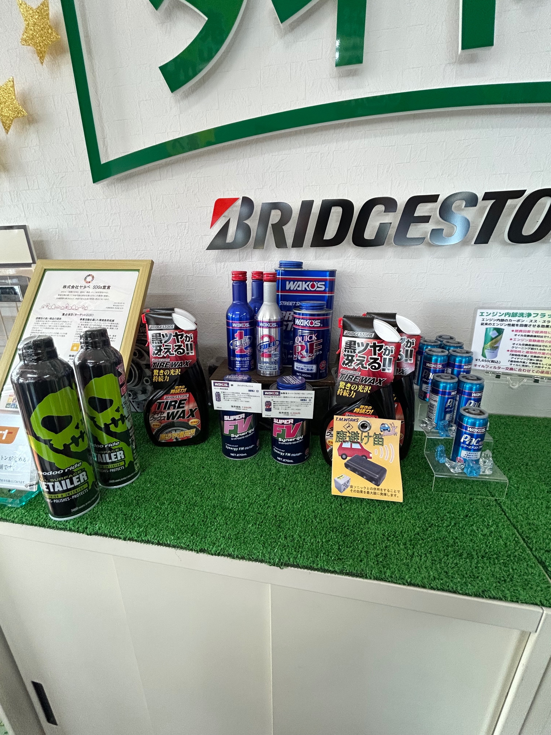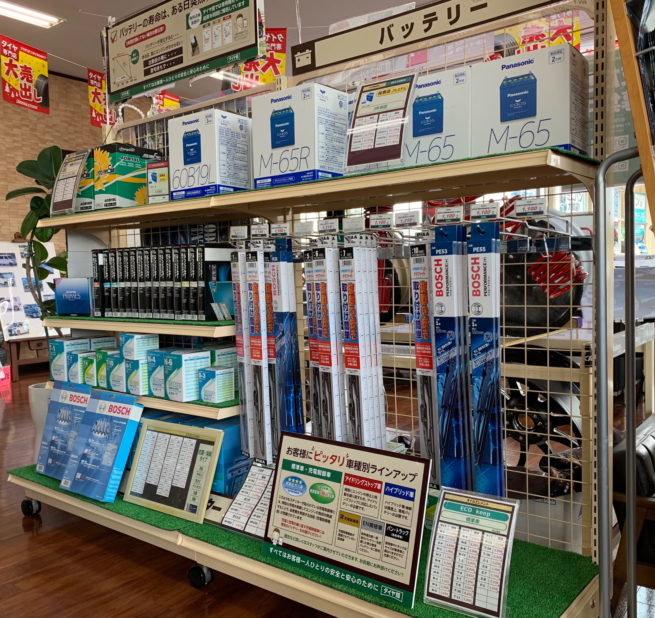 タイヤ館はタイヤ、ホイールだけと思われがちですがワイパー、バッテリー、オイルはもちろん洗車洗剤やオイル、ガソリンの添加剤などのケミカル商品も数多く取り扱いしております。