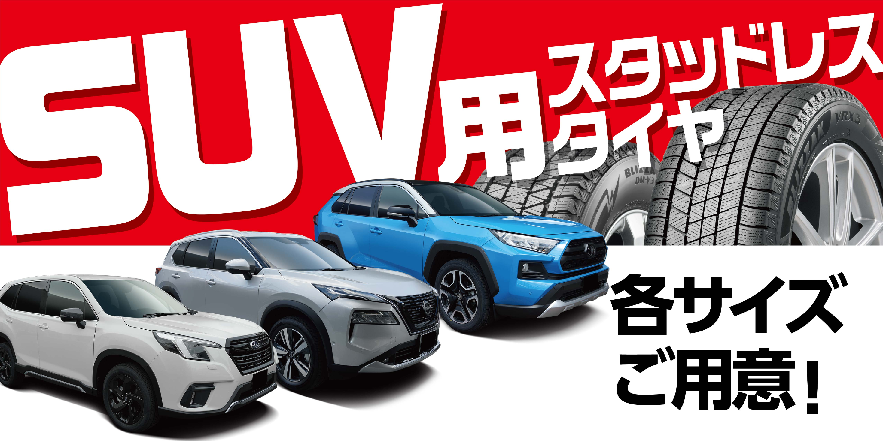 ①フレキシブル発泡ゴムで、経年しても柔らかい! ②パタン進化でしっかり止まる、曲がる! ③ブリザック史上最高性能! ④SUVサイズ拡大スタッドレス! 我らがブリヂストンの自信作です!